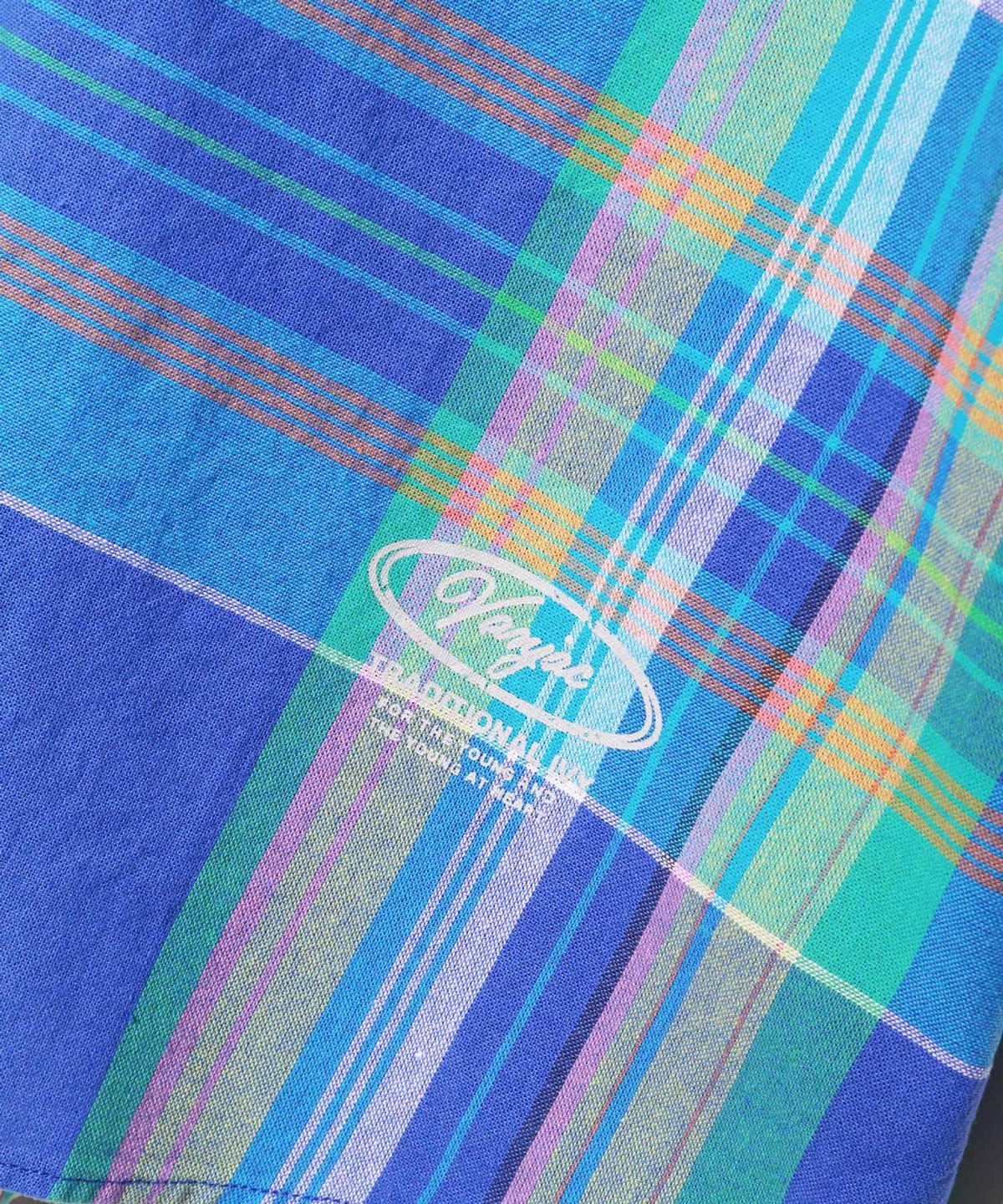 ■鮮やかなブルーを基調にしたチェックのオリジナル生地で、発色の良い配色が魅力の一枚