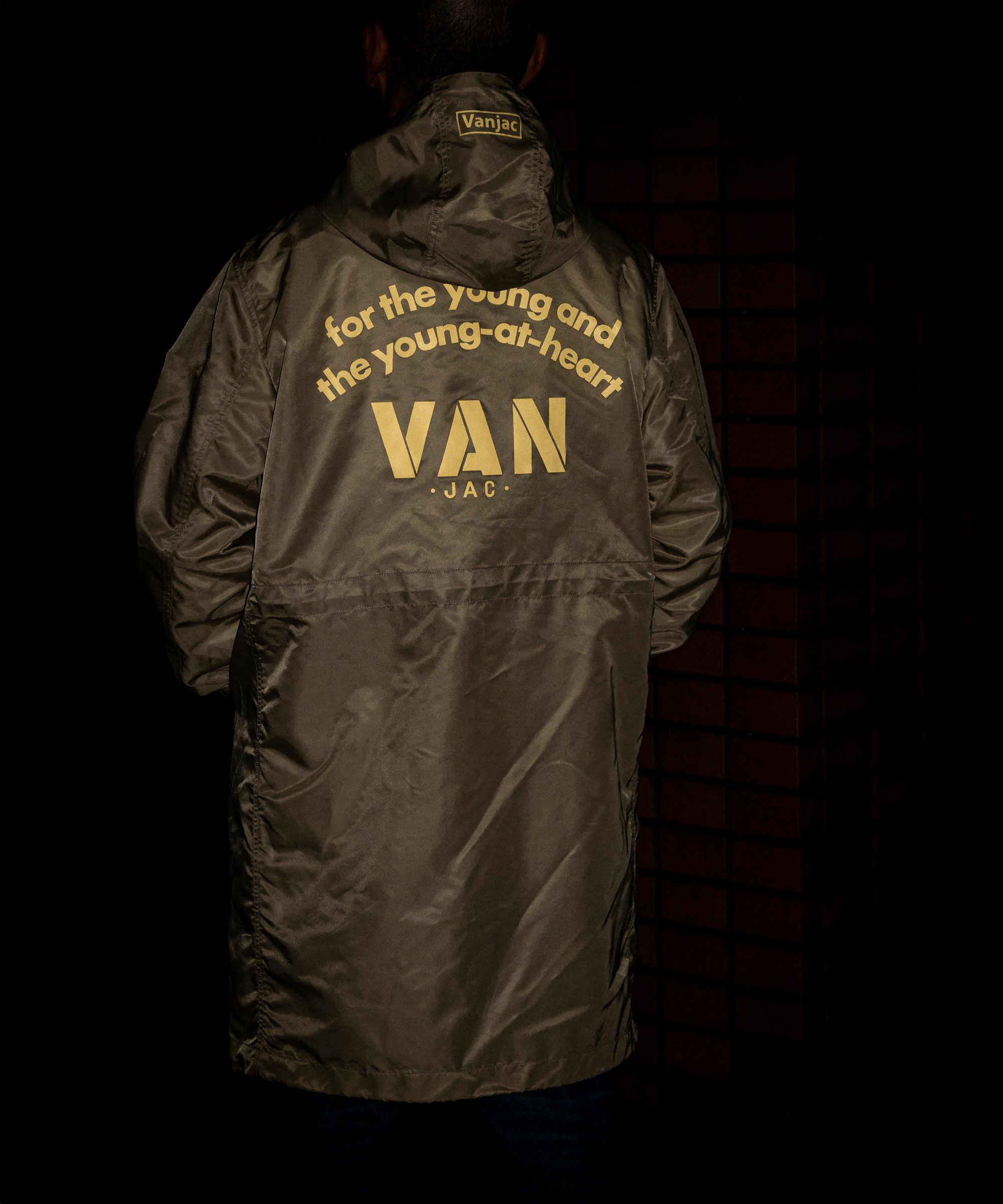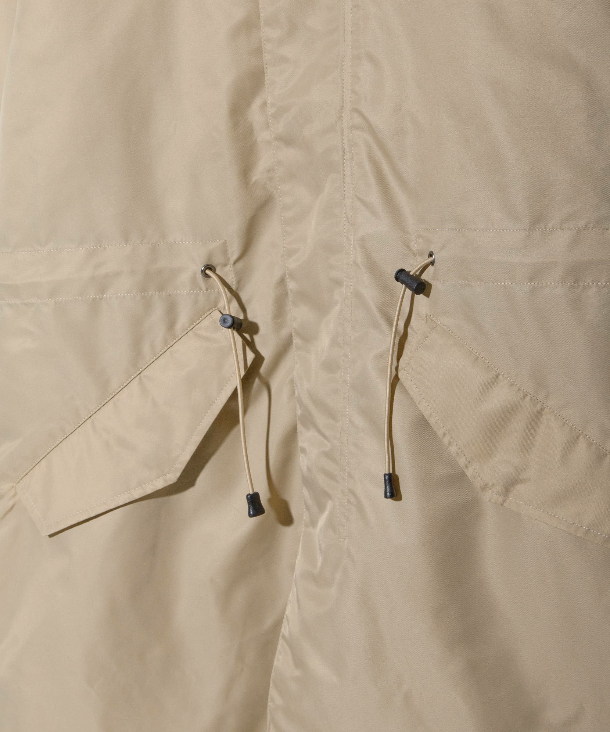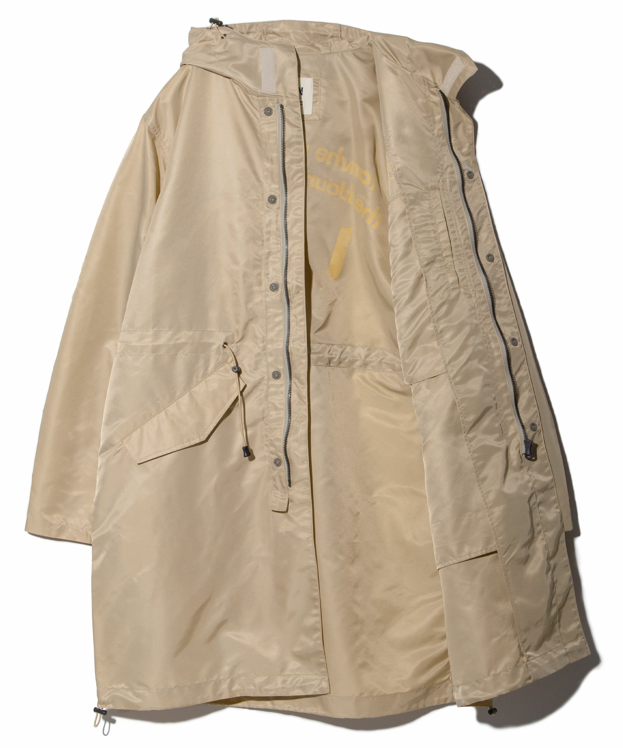 裏地を付けず1枚仕立ての軽い羽織りとして活躍するモッズコートをベースにしたフーデッドコート。