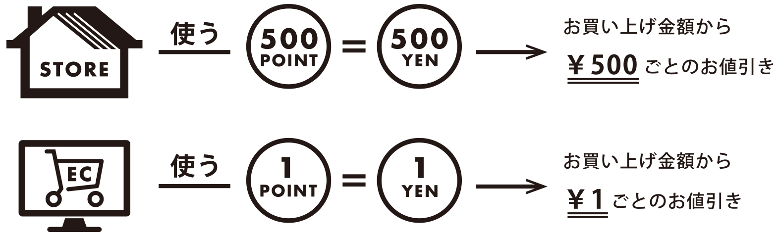 オンラインストアでは1ポイント=1円単位として次回以降のお買い物からご利用いただけます。