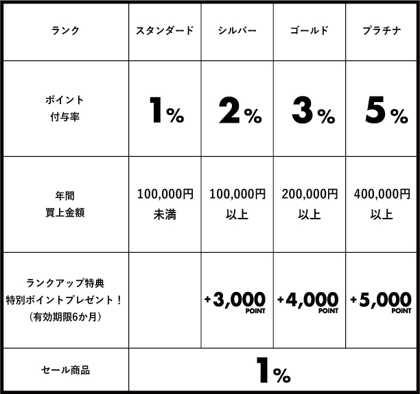 (※セール商品の場合の還元率は、どのランクのお客様も一律1%となります。)