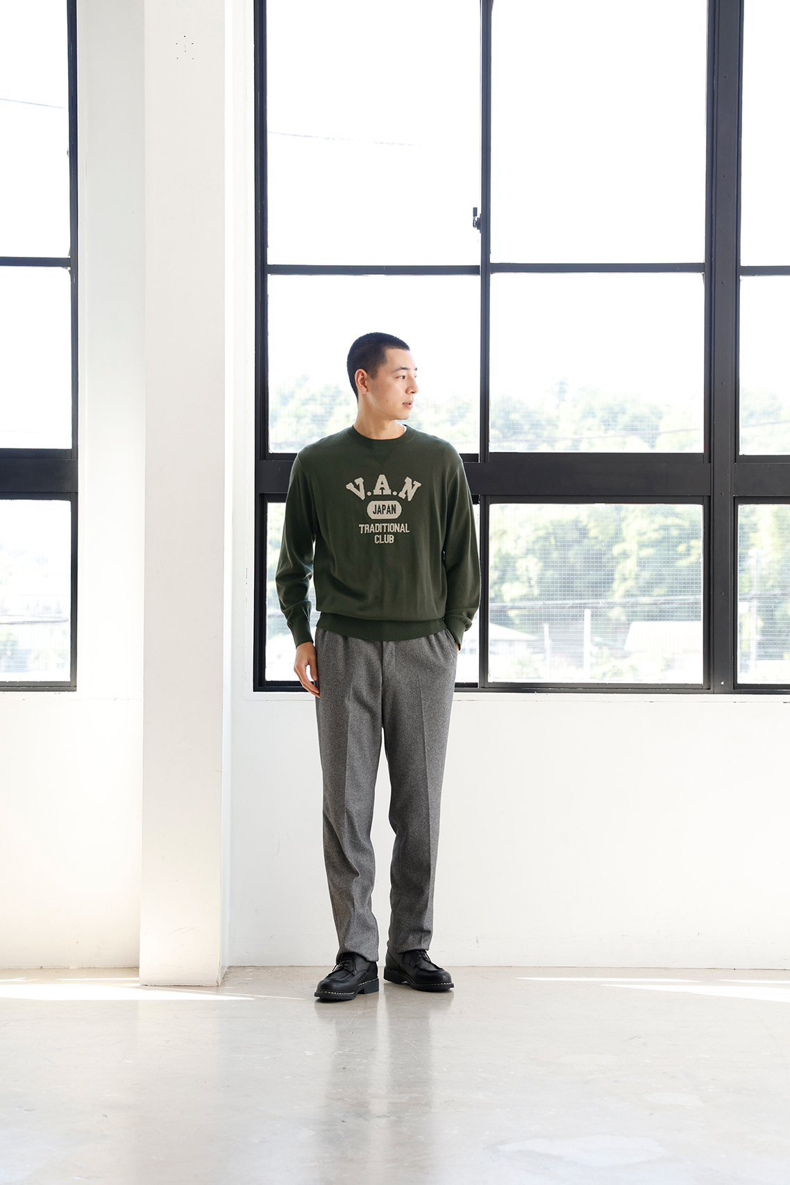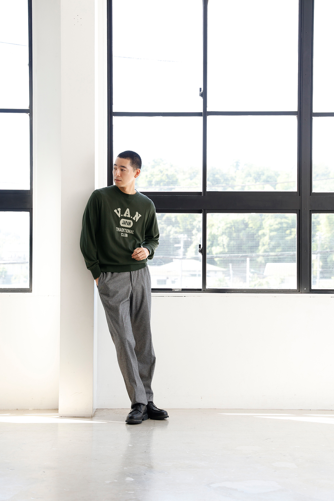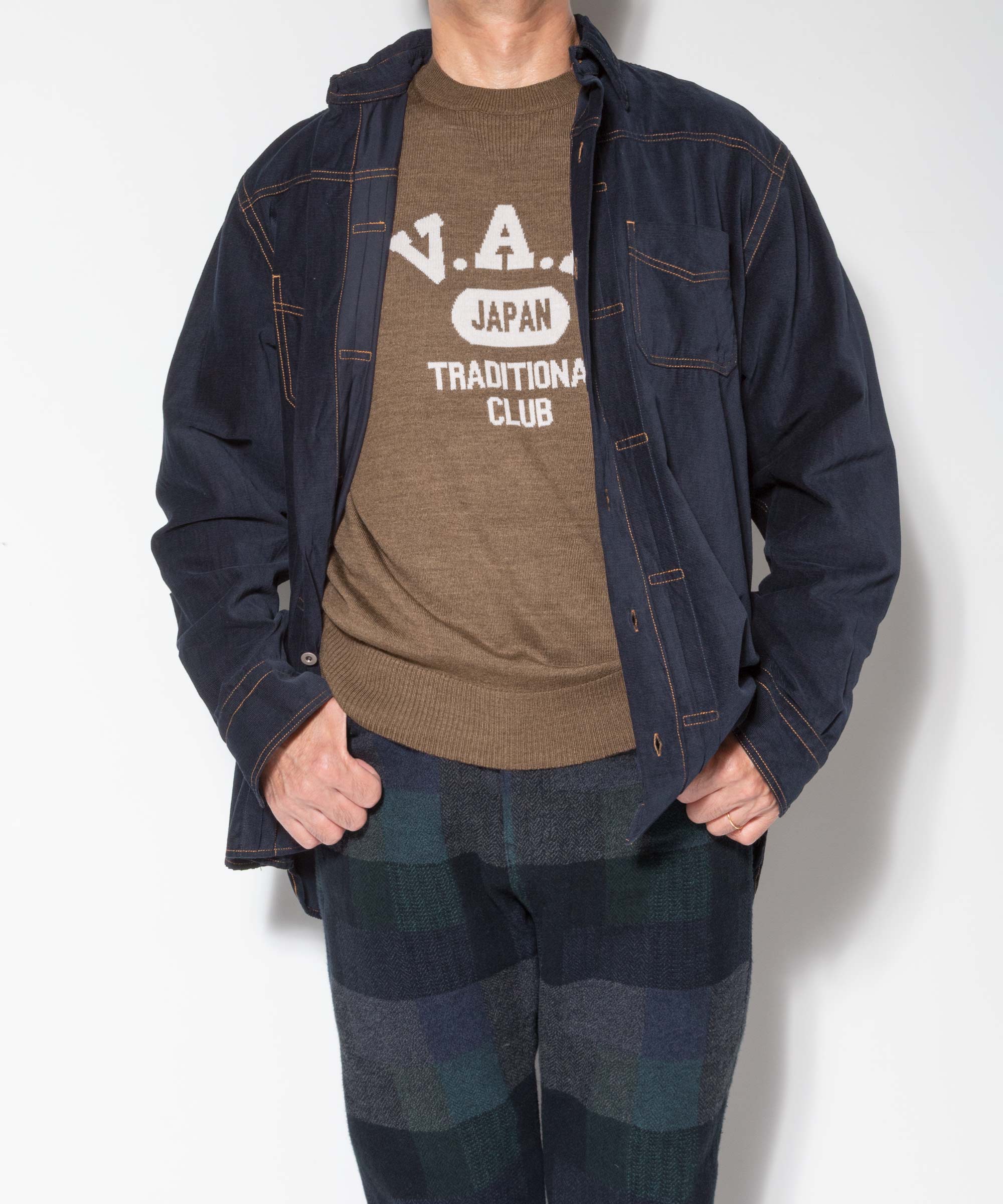 さりげないスエード調のエルボーパッチ(VJ刺繍入り)と、背面の首元にあしらわれた「TOKYO TRADITIONAL IVY」の刺繍が、ブランドのコンセプトを表現。シャツとのレイヤードも楽しめる品の良いデザインで、大人の日常に寄り添うトラッドスタイルをさりげなく格上げします。