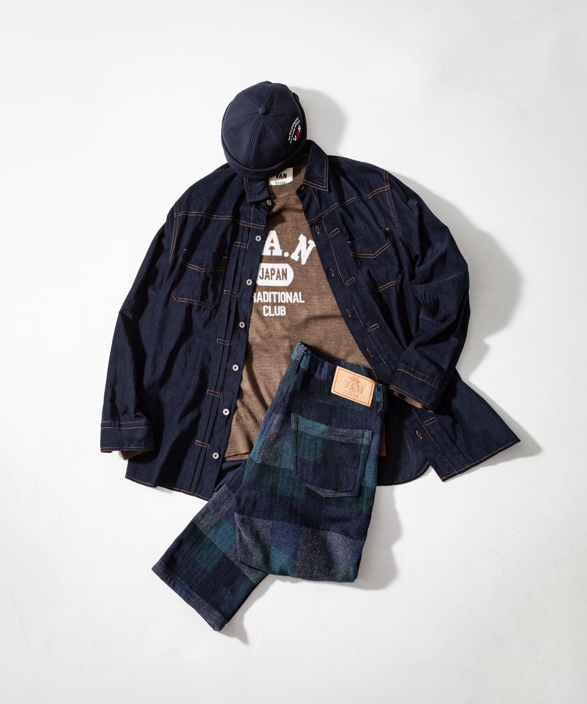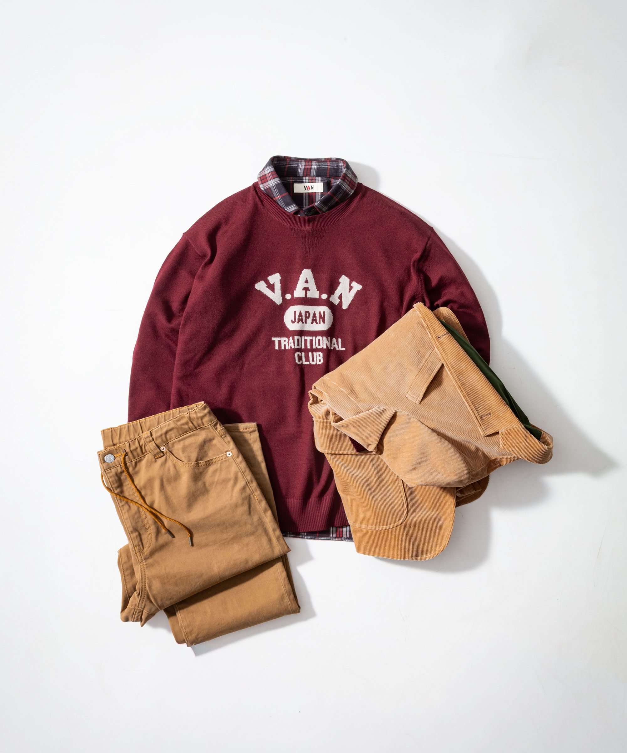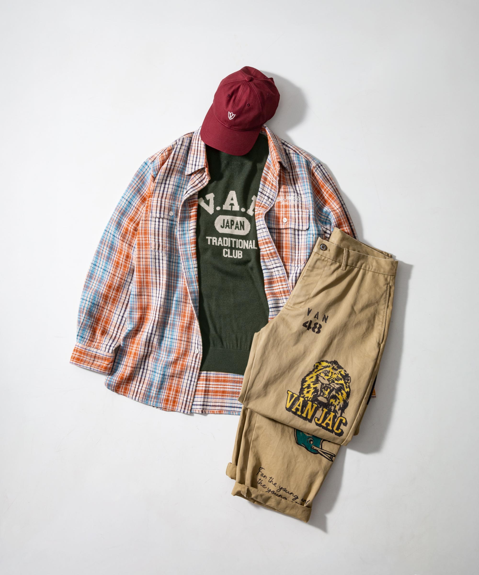 ヘビーウェイトワークシャツ ¥24,200(税込)インターシャロゴセーター ¥23,100(税込)チノパンツ<メモリアルペイント> ¥39,600(税込)キャップ<Vエンブレム> ¥8,800(税込)