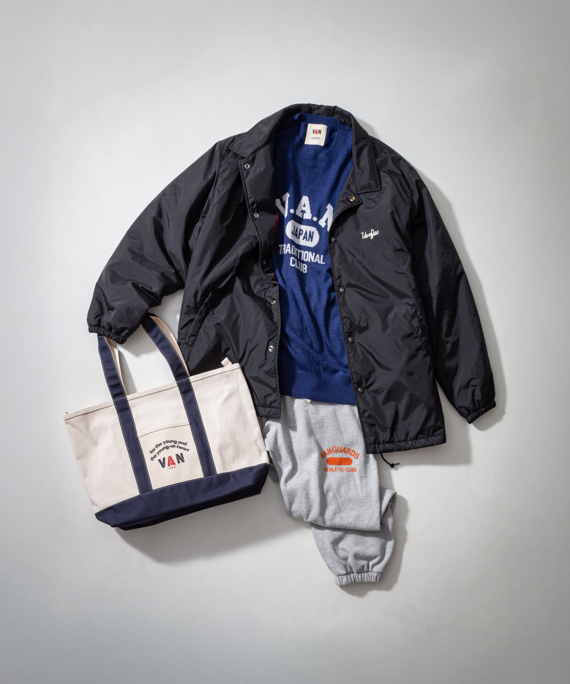 【今季発売予定】コーチジャケット ¥47,300(税込)インターシャロゴセーター ¥23,100(税込)スウェットパンツ<吊り裏毛> ¥24,200(税込)トートバッグ<アーチロゴ> ¥15,400(税込)