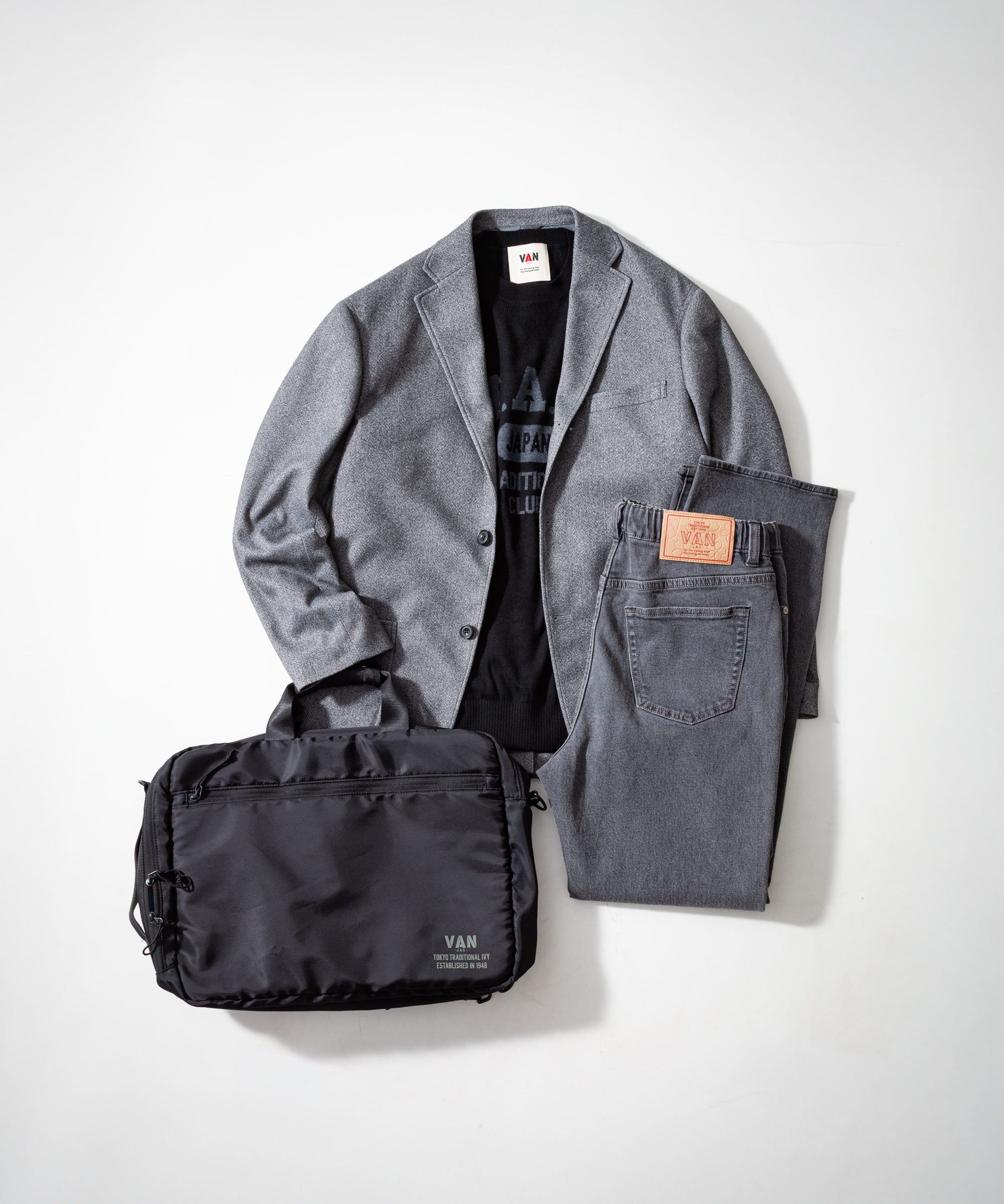 【今季発売予定】ジャージージャケット ¥55,000(税込)インターシャロゴセーター ¥23,100(税込)イージーデニムパンツ<ストレッチ> ¥37,400(税込)【今季発売予定】3WAYバッグ ¥36,300(税込)