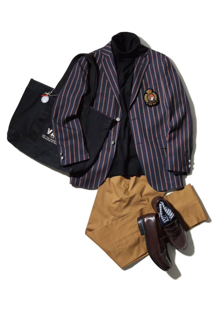 アイビーストライプジャケット ¥75,900(税込)タートルネックセーター ¥19,800(税込)コットンストレッチパンツ ¥24,200(税込)トートバッグ ¥19,800(税込)
