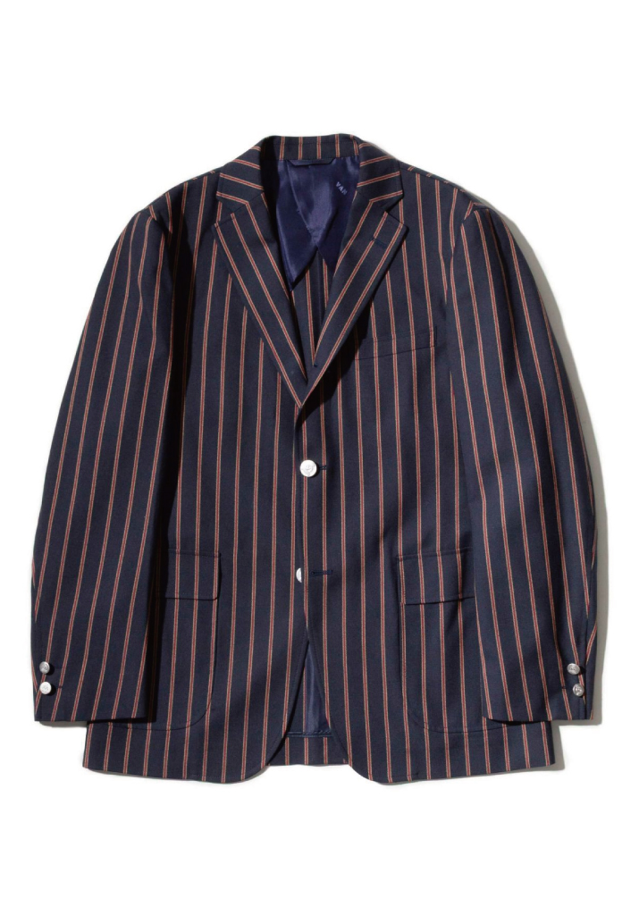 ストライプのピッチや色を糸から調整し編み上げたオリジナルアイビーストライプ。日本人の体型に合わせたパターンと、肩パット・裄わたを省いた軽やかな設計で自然なフィット感が特徴の〈アーバンナチュラルモデル〉を採用し