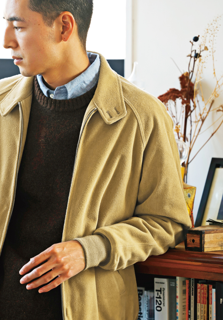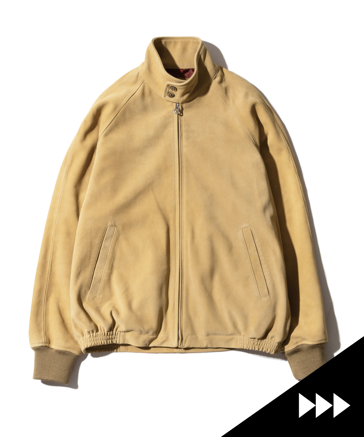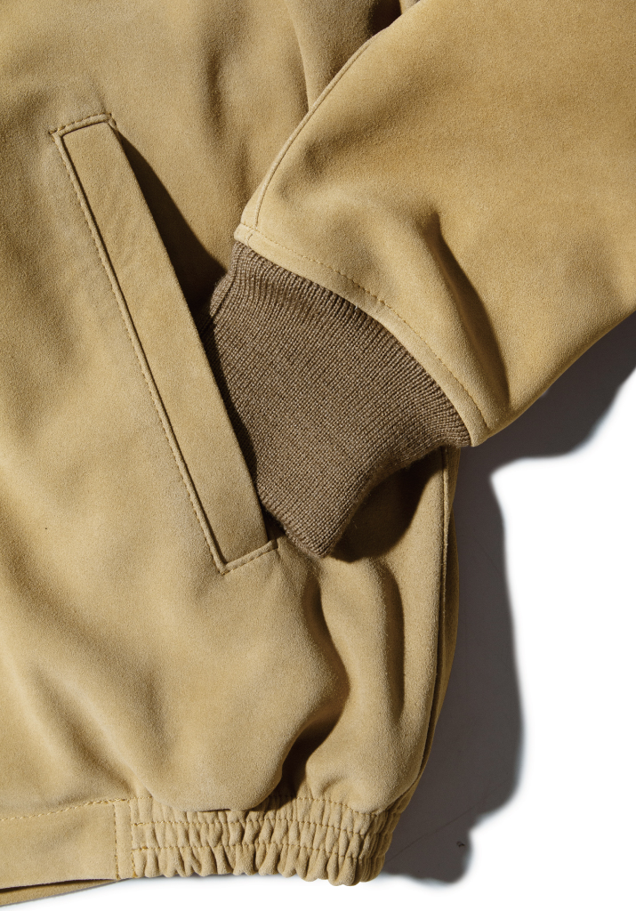 ゴートレザーを使用したスウェードスウィングトップ。贅沢にもオールレザーで仕上げ、マガジンポケット部分には色落ちを防ぐために表革を使用。裏地にはオリジナルのジャガード生地を用い、永くご愛用頂くのに相応しい拘りぬいた一品です。