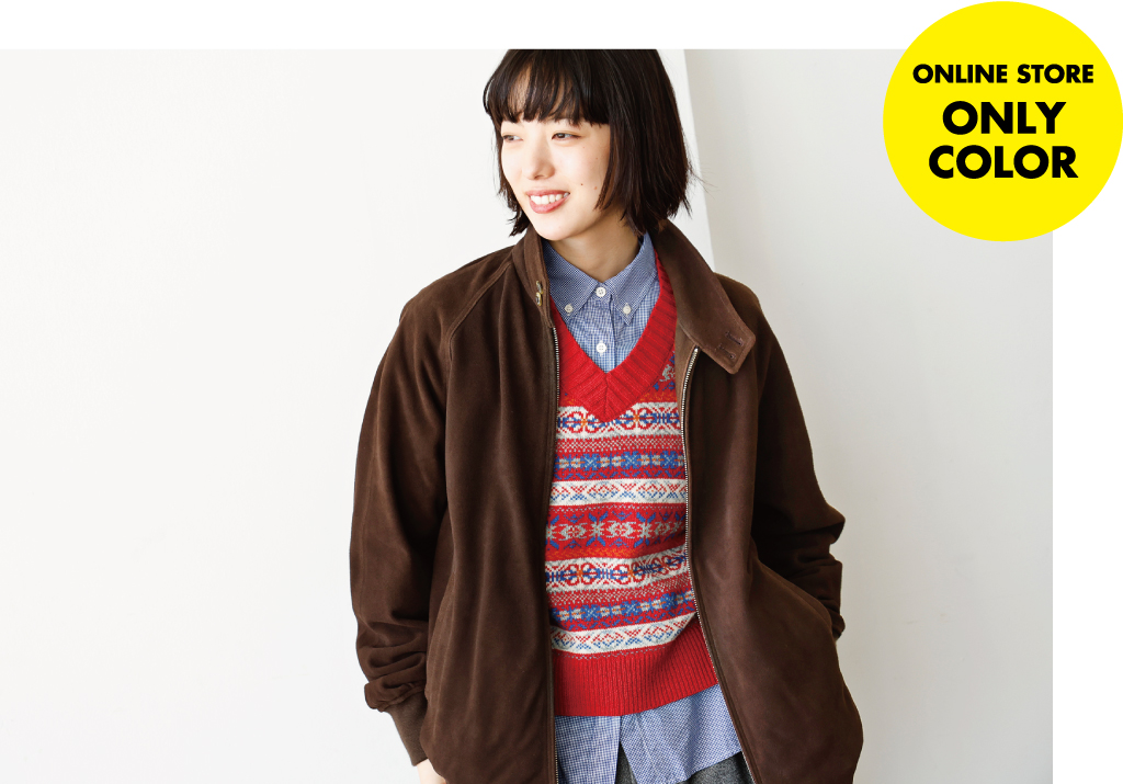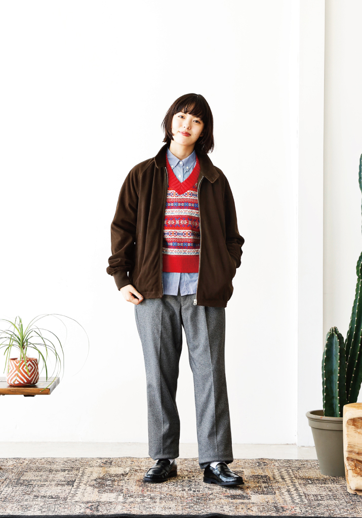 スウェードスウィングトップ ¥151,800(税込)フェアアイルベスト<ウィメンズ> ¥19,800(税込)ブロードBDシャツ<ウィメンズ> ¥15,400(税込)イージーパンツ<ジャージーホームスパン> ¥33,000(税込)