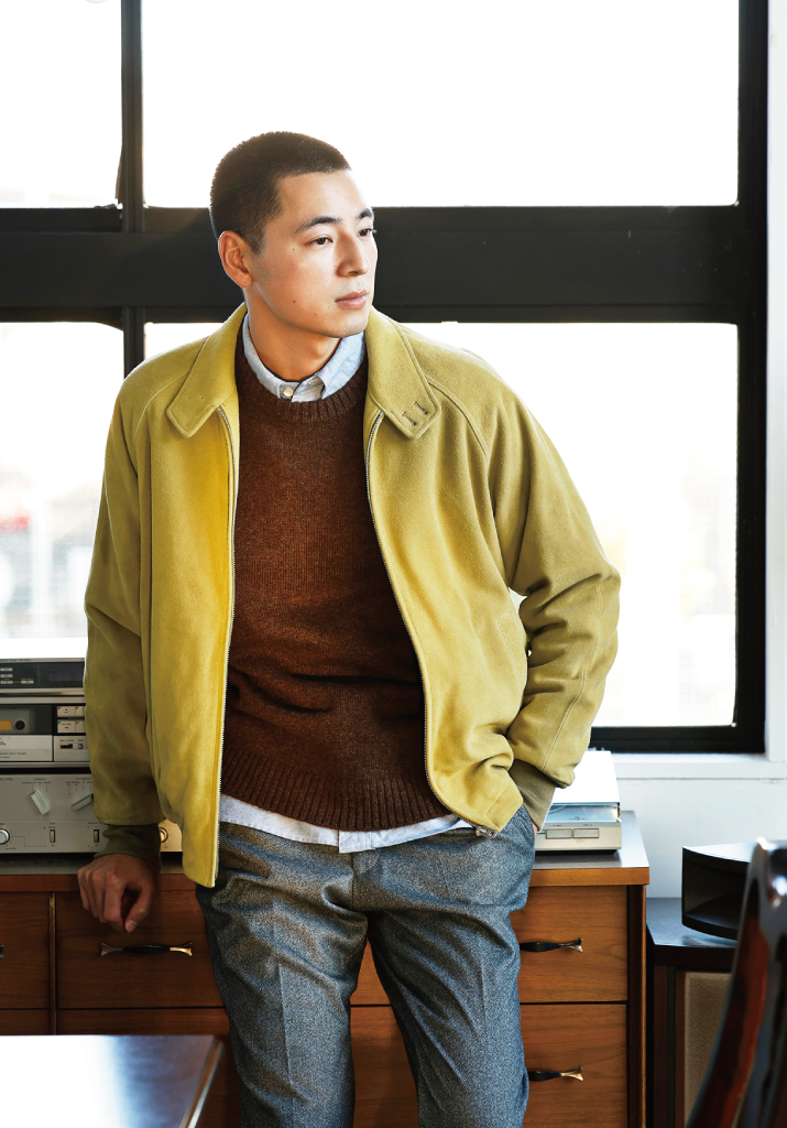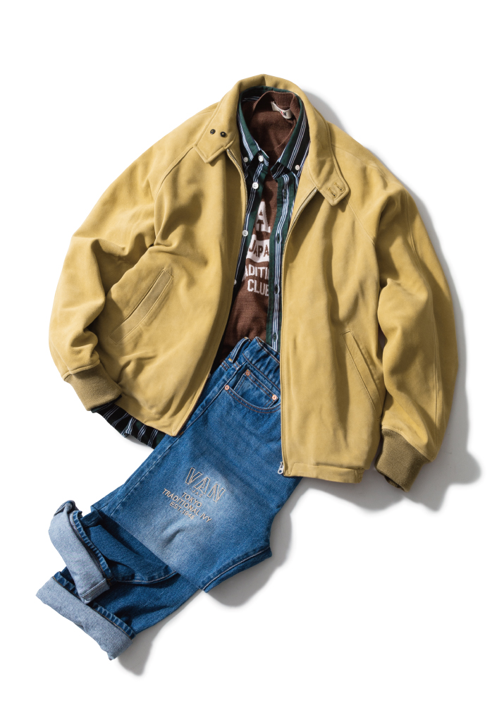 スウェードスウィングトップ ¥151,800(税込)ロゴセーター ¥23,100(税込)ショートBDシャツ ¥19,250(税込)デニムパンツ ¥37,400(税込)