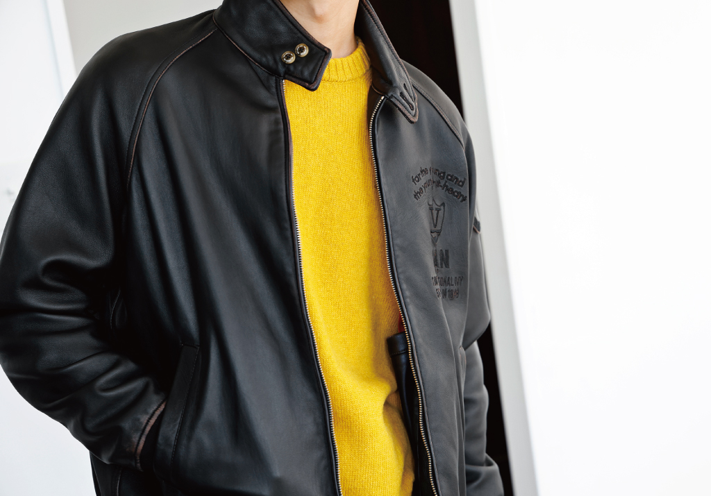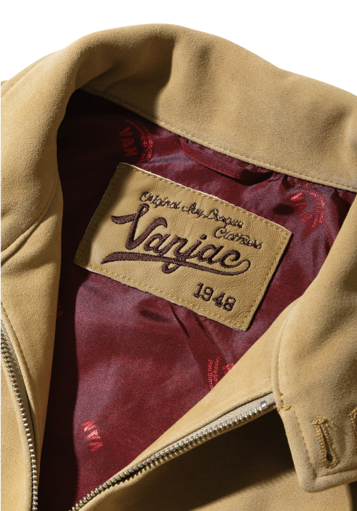 テーラードジャケットで使用しているロゴ入りのジャカード裏地を使用し、首元のネームにはVAN謹製の証として、表革に刺繍を施したスペシャルネームを配置。