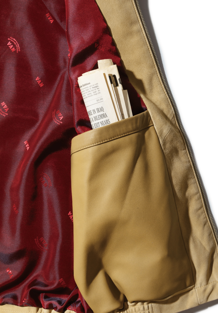 VANのスウィングトップのシグネチャーとなるマガジンポケットは今作でも健在。スウェードは素材の特性上色落ちや色移りがしやすくなっている為、表革を使用。表地と同様ゴートレザーで仕上げています。