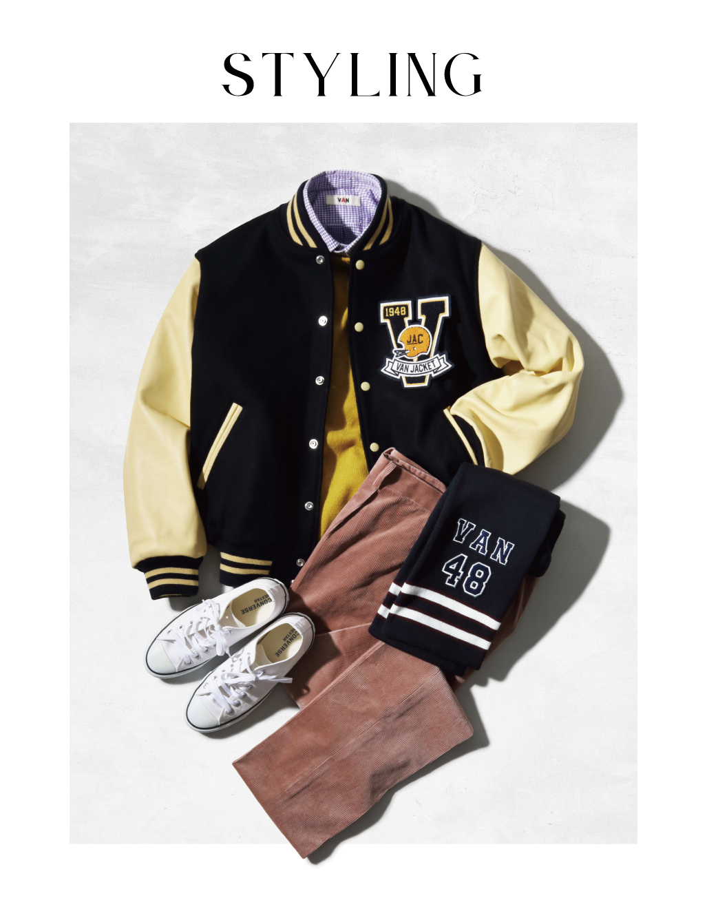 スタジアムジャンパー ¥97,900(税込)シェットランドセーター ¥19,800(税込)ショートBDシャツ<カラーギンガムチェック> ¥18,700(税込)コーデュロイパンツ<ストレッチ> ¥34,100(税込)マフラー<プレミアムスタジャン> ¥10,780(税込)