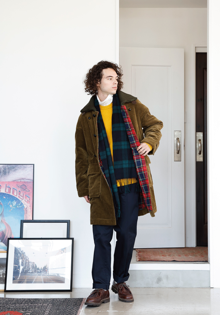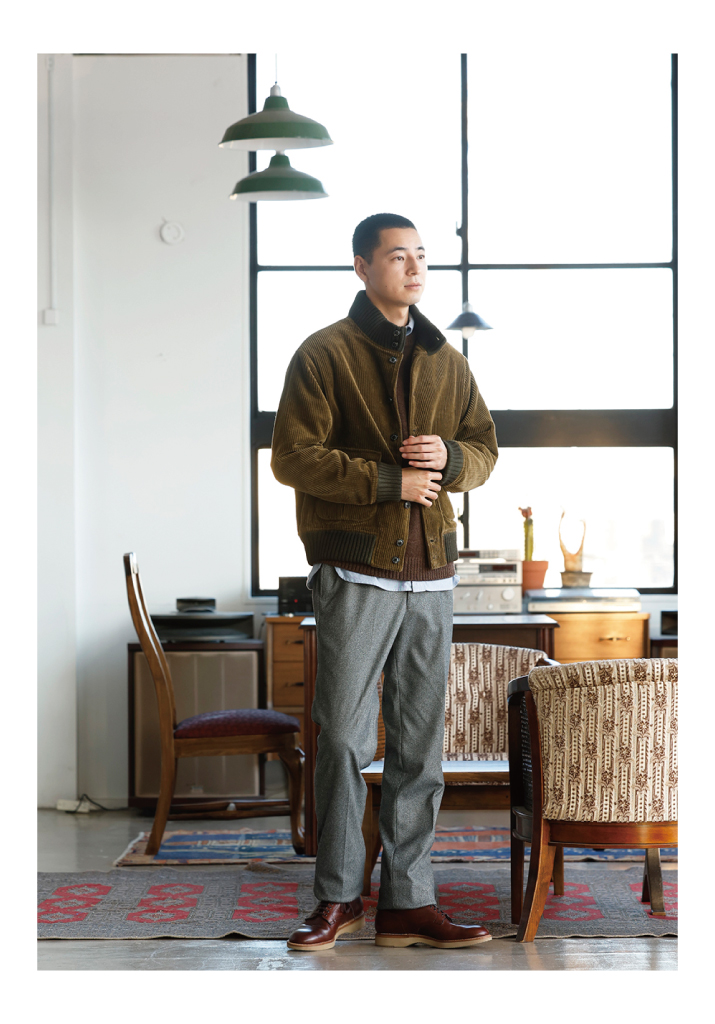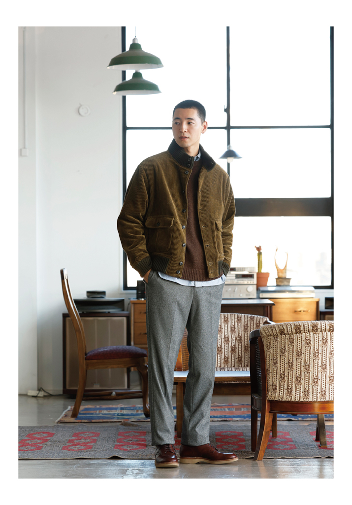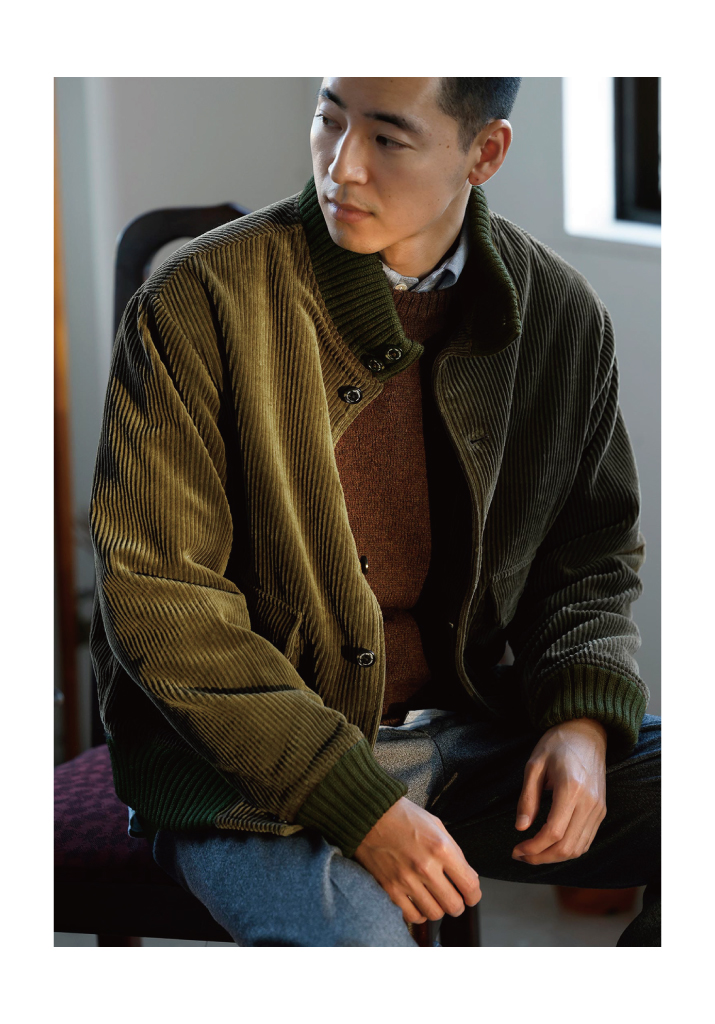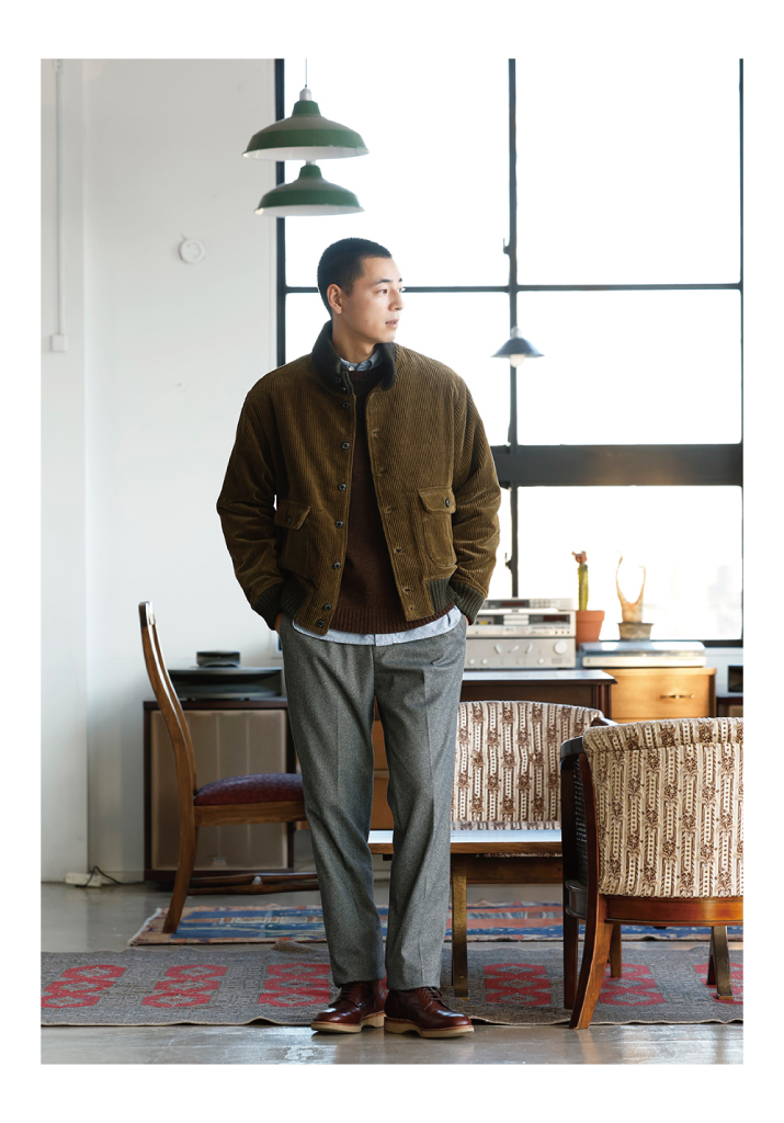 スタンドカラーブルゾン ¥49,500(税込)シェットランドセーター ¥19,800(税込)BDシャツ ¥19,800(税込)サキソニーパンツ ¥36,300(税込)