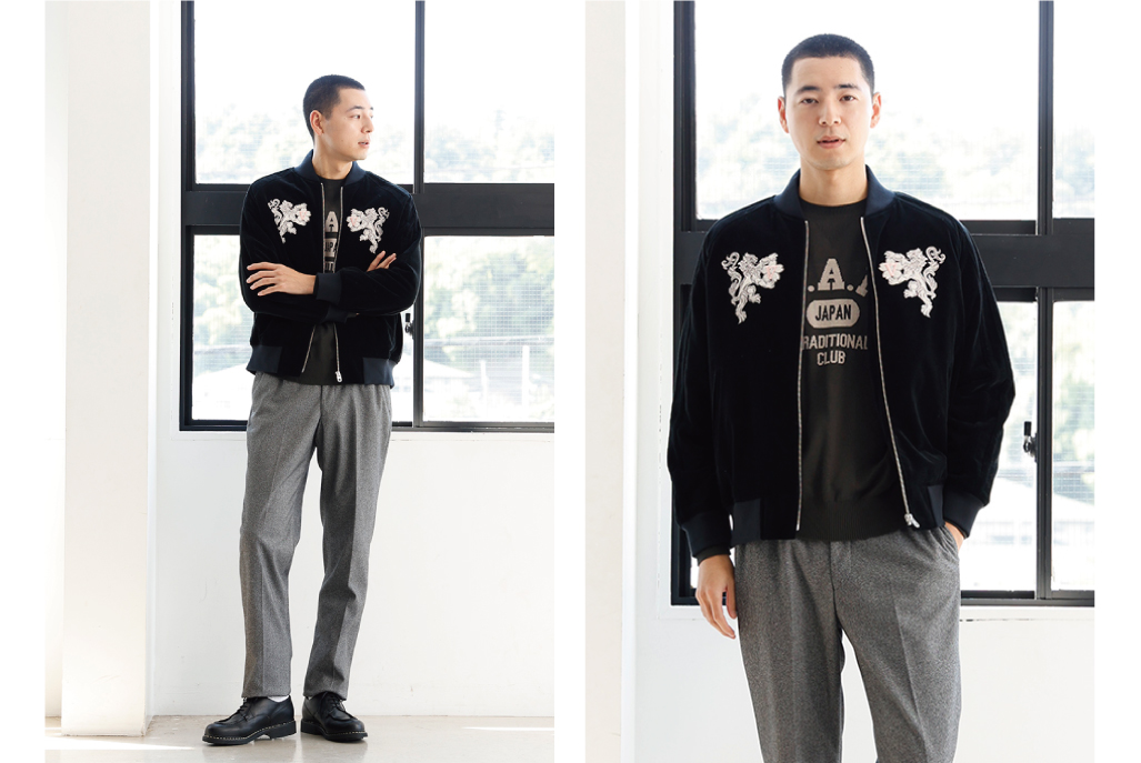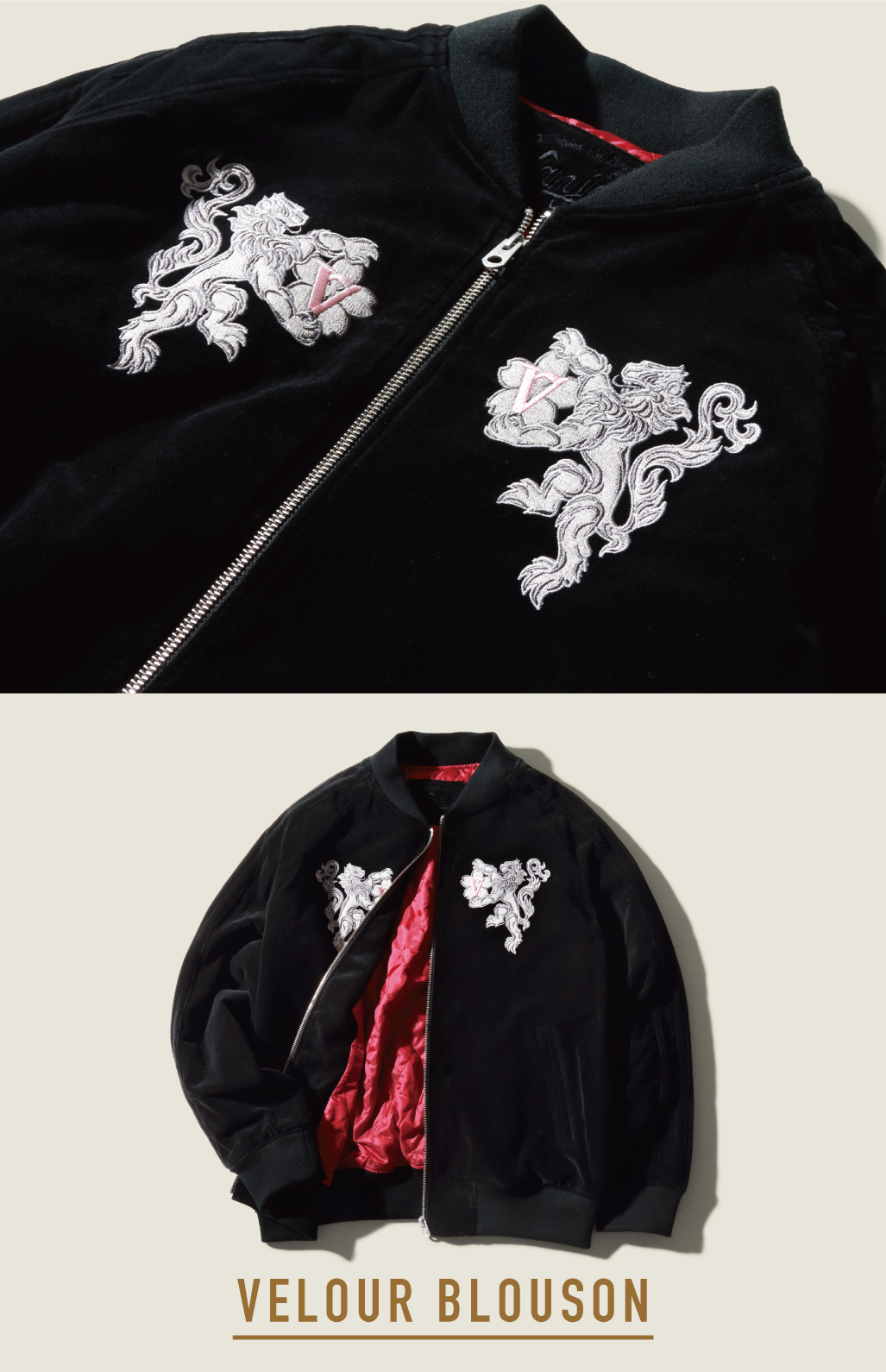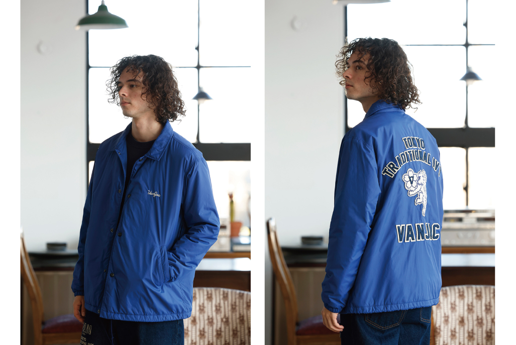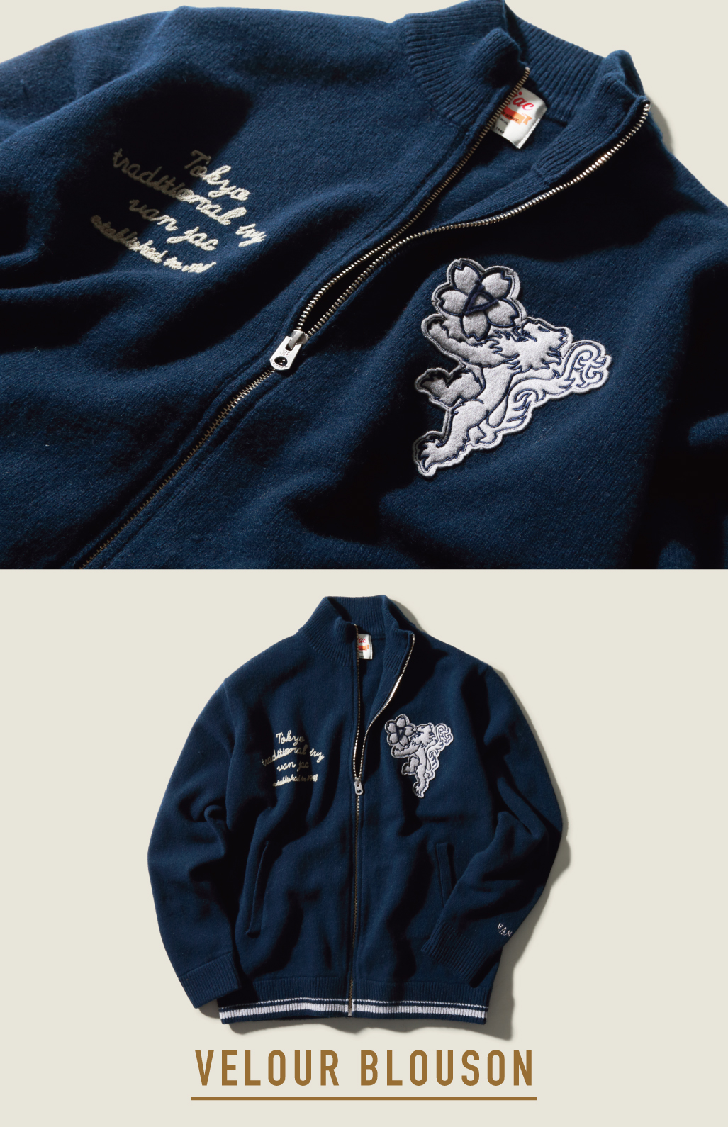 VANのシンボル「桜獅子」は、もともと「向い獅子」から始まり、2000年以降に新たなデザインへ進化しました。力強さを象徴する獅子に、日本の国花・桜を組み合わせることで、伝統と日本らしさを表現しています。今回のベロアブルゾンには、両胸に桜獅子の刺繍を向かい合わせで配置。存在感のあるデザインながら、デイリーに着やすい大人の一着に仕上げました。