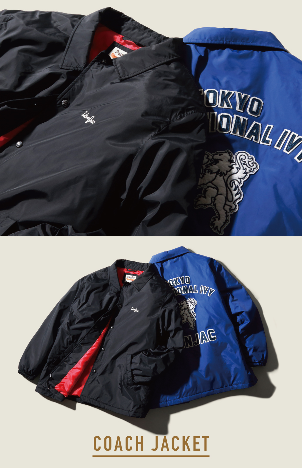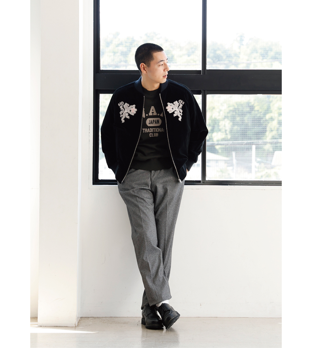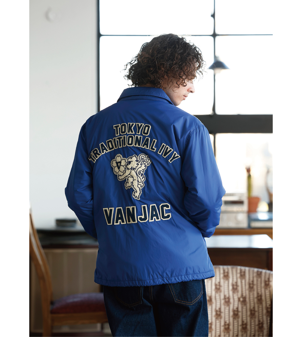 VANのシンボル「桜獅子」は、もともと「向い獅子」から始まり、2000年以降に新たなデザインへ進化しました。力強さを象徴する獅子に、日本の国花・桜を組み合わせることで、伝統と日本らしさを表現しています。今回のベロアブルゾンには、両胸に桜獅子の刺繍を向かい合わせで配置。存在感のあるデザインながら、デイリーに着やすい大人の一着に仕上げました。