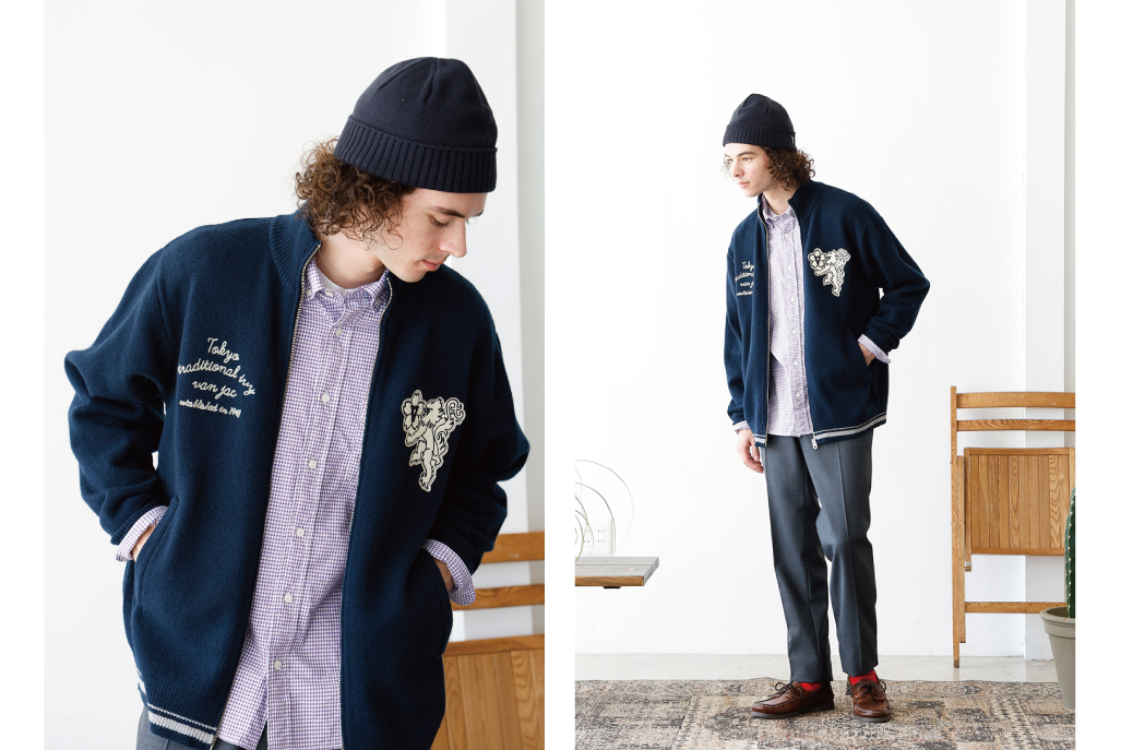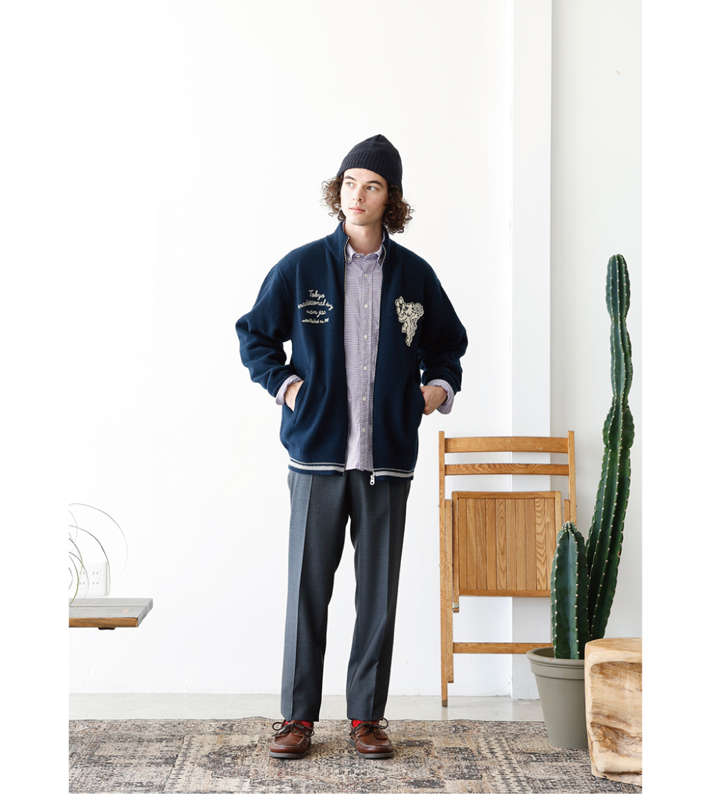 首元までしっかり温かく、春先まで頼れるジップセーター。ふっくらとしたタッチと優れた保温性を持つラムズウールを使用し、スタンドアップ仕様の衿元が首まわりをやさしく包み込みます。左胸にはVANのシンボル「桜獅子」のフェルトワッペンを配し、右胸にはブランドコンセプト「TOKYO TRADITIONAL IVY」をチェーン刺繍でさりげなく表現。左袖のロゴ刺繍やオリジナルファスナートップなど、細部までこだわりを感じる仕上がりです。羽織としてはもちろん、コートのインナーとしても活躍する、シーズンを通して重宝する一着です。