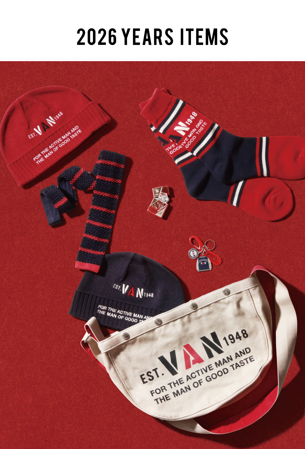 VANの象徴カラー“赤”をテーマに、新しい年のスタートを華やかに彩る2026年イヤーズシリーズが登場。ブランドのルーツである70年代スピリットを随所に取り入れながら、日常に取り入れやすい実用性と、VANらしいデザイン性を兼ね備えたラインアップです。使いやすいショルダーバッグや表情豊かなチャームキーホルダー、上質なシルクネクタイ、暖かく快適なルームソックス、スタイルを選ばないニットキャップなど、多彩なアイテムが勢ぞろい。さりげなく赤を効かせた配色や、70年代のキャッチコピー「FOR THE ACTIVE MAN AND THE MAN OF GOOD TASTE」をポイントにしたデザインがシリーズ全体に一貫した魅力を生み出し、ギフトにも自分用にも選びたくなる仕上がりです。