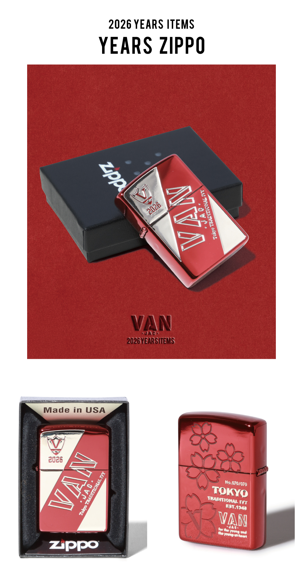 VANの象徴カラーである“赤”をテーマにした、2026年イヤーズシリーズのZippo。レッド×シルバーのメタリックな配色に、表面はVANロゴと<V>エンブレム、裏面には桜と「TOKYO TRADITIONAL IVY」をあしらった特別デザインです。精緻なエッジング加工で立体感を持たせ、風に強く火力が安定する頑丈な作りは日常からアウトドアまで幅広く活躍。オイルライターならではの香りと開閉音が大人の所有欲を満たす一品です。