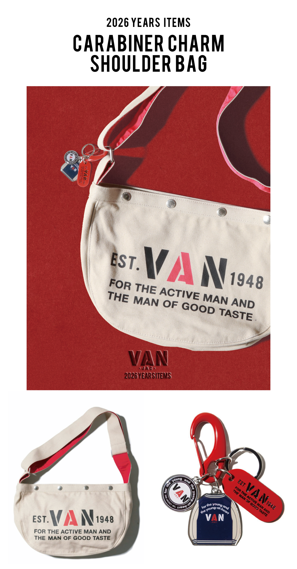 VANの象徴カラー“赤”をテーマにした2026年イヤーズシリーズから、毎日使いやすいショルダーバッグと、人気チャーム付きのカラビナキーホルダーが登場。ショルダーは丈夫で軽量なキャンバス素材を使用し、内側や紐裏に赤を効かせたさりげないアクセントが魅力。口が広く使いやすいため、デイリーから旅行のサブバッグまで幅広く活躍します。カラビナキーホルダーは、70年代のキャッチコピー、丸VANロゴ、スタジャンをモチーフにした3種のチャームをセット。バッグや鍵に簡単に付けられ、ギフトにも最適です。新しい年を華やかに彩る、VANらしさあふれる2アイテムです。