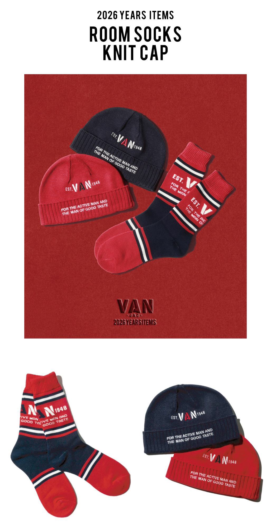 VANの象徴カラー“赤”をテーマにした2026年イヤーズシリーズから、70年代スピリットを受け継ぐルームソックスとニットキャップが登場。ルームソックスは、つま先から足首までパイル生地を使用した柔らかな履き心地で、吸水性・保温性にも優れた快適なアイテム。レッド×ネイビーの華やかな配色と、70年代のキャッチコピーをポイントにしたデザインが、足元から気分を明るくしてくれます。ニットキャップは、アクリル糸ならではのふっくらとした風合いと優しい肌触りが魅力。ダーツ仕様による立体的なシルエットでフィット感も抜群です。ベーシックなネイビーとアクセントになるレッドの2色展開で、幅広いスタイルにマッチします。新しい年のスタートを華やかに彩る、デザイン性と快適さを兼ね備えたイヤーズアイテムです。