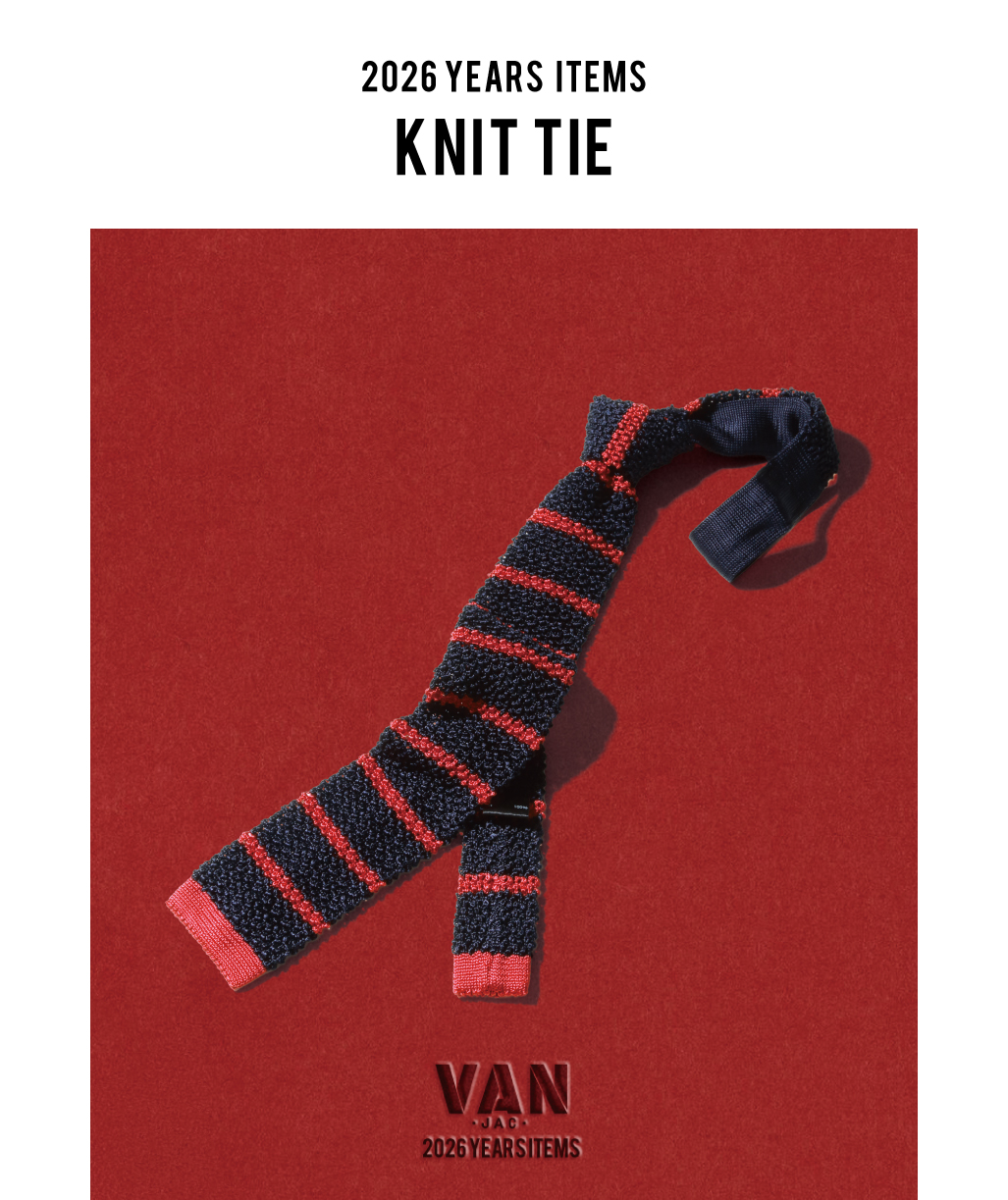 VANの印象的なロゴカラー“赤”をテーマにした、2026年イヤーズシリーズのオリジナルネクタイ。上質な生地にこだわり、日本で丁寧に縫製されたシルク100%の一本です。シルクならではの品のあるツヤ感と、スマートな印象を与えるボーダー柄が特徴。レッド×ネイビーの鮮やかな配色が新しい年の装いを華やかに彩り、コーディネートのアクセントとしても活躍します。