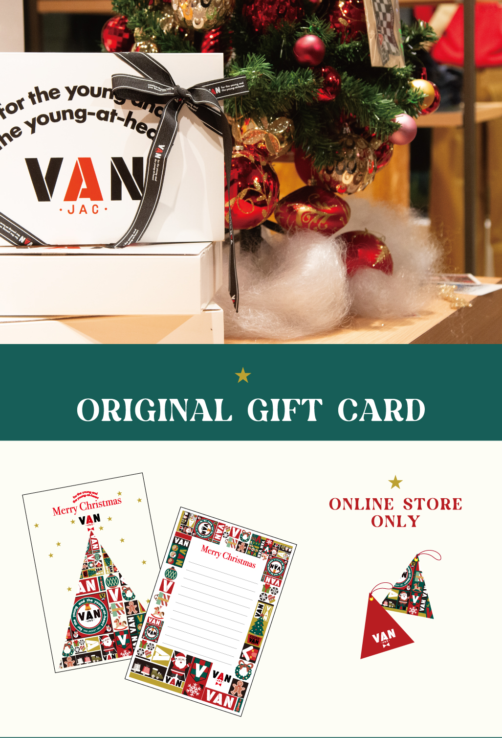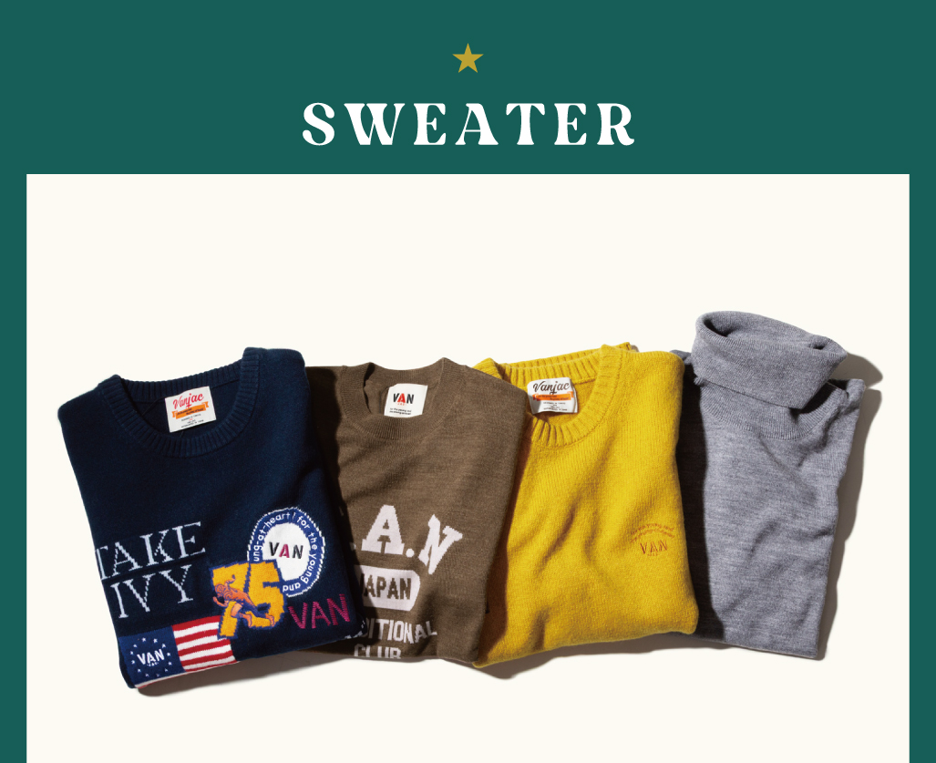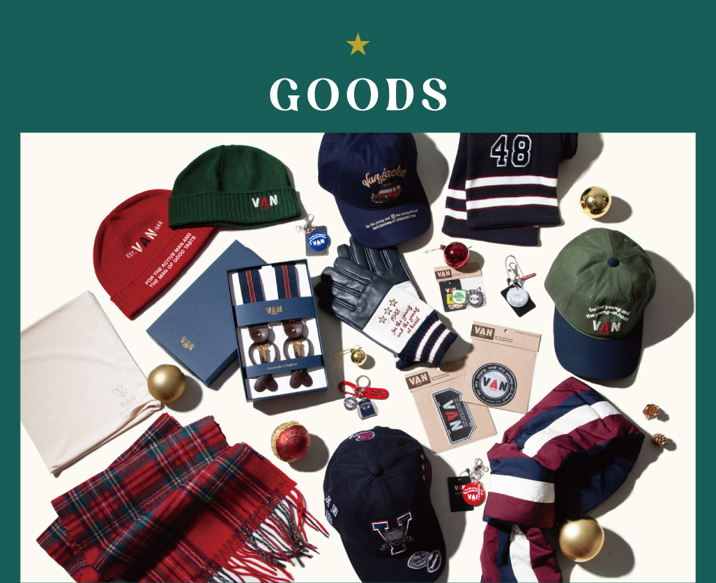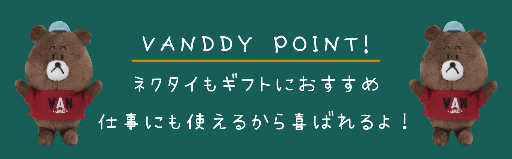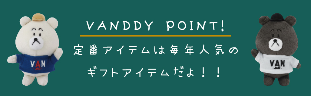 VAN ONLINE STORE INFORMATION PAGE#INFORMATIONVAN JACKET ONLINE STORE2025.12.05VAN CHRISTMAS GIFT 2025HOT ITEM2025.12.05●●●●●●●●●●●●「VANDDY」 is COMING SOON!!VANの新しいマスコットキャラクター「VANDDY」です。これから色々な商品となって皆さまにお会いいたしますので、楽しみにお待ちください。日頃お世話になっている人や、大切な友人、家族にクリスマスのギフトを贈りませんか?そんなクリスマスギフトにぴったりの商品をご紹介。12月24日AM9:00までのご注文で、クリスマス限定のタグとメッセージカードを添えてお届けいたします。なかなか外出の出来ないこんな時期だからこそ、大切なあの人に気持ちを伝えるのにVANのギフトをお使いください。※クリスマス限定ギフトは12月24日AM9:30までのご注文商品が対象となりますが、12月25日までのお届けをご希望の際は12月23日AM9:00までにご注文をお済ませくださいませ。12月23日AM9:00をすぎますと12月25日までのお届けが出来兼ねますのでお早目にご注文くださいませ。冬の深まりをとともに魅力を増す、上質な一枚。落ち着いた大人の装いに寄り添い、柔らかな風合いと品のある表情でトラッドスタイルを上品に引き立てます。袖を通すたび、ほっと心まで温まるような安心感を与えてくれるニット。この季節の贈り物にもぴったり。大切な方へ、クリスマスに”あたたかさ”を届ける一着を。クルーネックセーター ¥30,800(税込)シェットランドセーター ¥19,800(税込)スタンドアップセーター ¥30,800(税込)レタードカーディガン ¥31,900(税込)インターシャロゴセーター ¥23,100(税込)タートルネックセーター ¥19,800(税込)肩の力を抜いて楽しめるのに、どこかほどよく整った印象。そんな大人の女性に似合う、カジュアルさとさりげない上質感を兼ね備えたアイテム。自然体で着られるデザインながら、素材の質感やシルエットがやわらかく女性らしさを引き立たせてくれます。「大切な方を思って選んだ」という気持ちが一番のプレゼント。そんな想いがこもった贈り物なら、きっと受け取った相手の心に温かく残るはず。ラップスカート ¥31,900(税込)フェアアイルニットベスト ¥19,800(税込)BDシャツワンピース ¥34,100(税込)ローカットソックス<裏パイル> ¥1,650(税込)スカート ¥19,800(税込)チルデンベスト ¥17,600(税込)VANがおすすめするアイテム。定番アイテムは、クリスマスプレゼントにぴったり。シンプルで上品なデザインは、普段のコーディネートにさっと馴染み、どんなスタイルの人にも喜ばれる商品。シャツやトレーナーなど、毎日使えるアイテムは実用的でありながら贈る相手への思いやりを感じられる一品です。どれも長く愛用できるVANの定番アイテムは、心に残るクリスマスギフトになります。ロングスリーブTシャツ ¥14,300(税込)トレーナー<バックロゴ> ¥19,800(税込)バックロゴ刺繍スウィングトップ ¥38,500(税込)ちょっとしたグッズのプレゼントは、気軽に渡せるのに、もらった人が思わず笑顔になるアイテム。実用的なものや、毎日使えるちょっとした雑貨、デザインの可愛い小物などは、日常にそっと彩りを添えてくれるので相手も自然に使いやすく嬉しい気持ちに。クリスマスのギフトにぴったりのアイテムです。ルームソックス<イヤーズ> ¥2,200(税込)ハンチング ¥9,350(税込)ニットキャップ ¥8,250(税込)ピンバッジ ¥2,530(税込)カラビナチャーム<イヤーズ> ¥6,490(税込)ツールボックス<ステッカーセット> ¥13,200(税込)キャップ ¥9,900(税込)マフラー ¥10,780(税込)レザーグローブ ¥13,200(税込)ネクタイ<スポーツ> ¥14,850(税込)ネクタイ<ロイヤルクレスト> ¥14,850(税込)ネクタイ<アイビーリーグ> ¥14,850(税込)ネクタイ<ジャケット> ¥14,850(税込)ネクタイ<レジメンタルストライプ> ¥13,750(税込)ネクタイ<レジメンタルストライプ> ¥13,750(税込)ジャガードタイ<メダリオン> ¥15,950(税込)ジャガードタイ<ペイズリー> ¥15,950(税込)ネクタイ<バイシクル> ¥14,850(税込)12月5日〜12月25日の期間中、ギフトラッピングをご希望のお客様にオリジナルクリスマスカードを添えてお届け!オンラインストア限定にてクリスマスツリーデザインのオリジナルギフトタグをつけてラッピングをさせていただきます!※クリスマスラッピング以外をご希望のお客様はご購入の際に通信欄にクリスマスラッピング不要のご記載をお願いいたします。ご希望がない場合は全てクリスマスラッピングにてご対応させていただきます。SHARE :VAN ONLINE STORE INFORMATION LIST#INFORMATION2025.12.05#HOT ITEMVAN CHRISTMAS GIFT 2025READ NEWS2025.12.02#HOT ITEMクリスマスギフトキャンペーン開催!READ NEWS2025.11.28#HOT ITEMPREMIUM STADIUM JUMPERREAD NEWSVAN JACKET ONLINE STOREBACK TO LISTPAGETOP