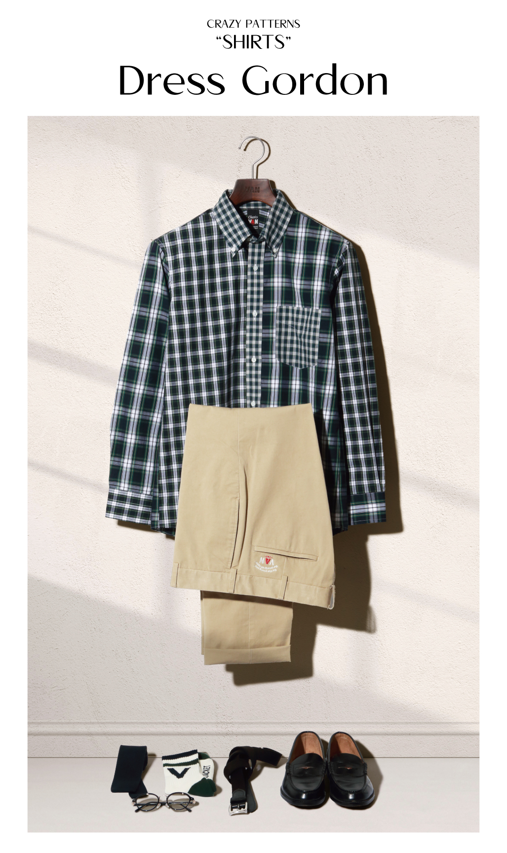 柄のサイズ感の違うドレスゴードン生地を3種類組み合わせたクレイジーパターンシャツです。大きめの柄と小さめの柄を合わせることでさりげないクレイジーさを演出。シンプルに合わせやすくブレザーとの相性も抜群。チノパンとコインローファーを合わせてアイビースタイルの完成。1枚で来てもサマになるアイテムです。