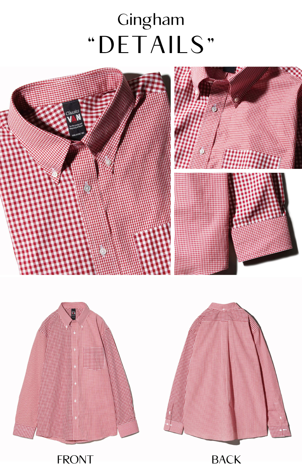 VANが厳選した生地を使用。オリジナルパターンにて配色も決めたVANらしいクレイジーパターンです。様々なシーンにマッチするようにイメージの違う3柄をご用意いたしました。無地とロンドンストライプを組み合わせたオックスフォードシャツや人気の高いドレスゴードンシャツもまとまりのある仕上がりに。レッドのギンガムチェックは取り入れるだけでコーディネートがグッと華やかになるので1枚持っていると差し色としても使い勝手の良い1枚です。