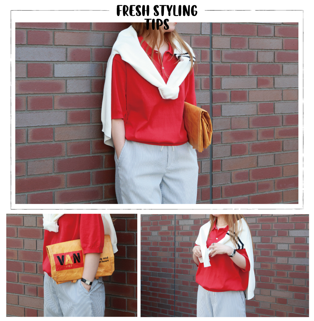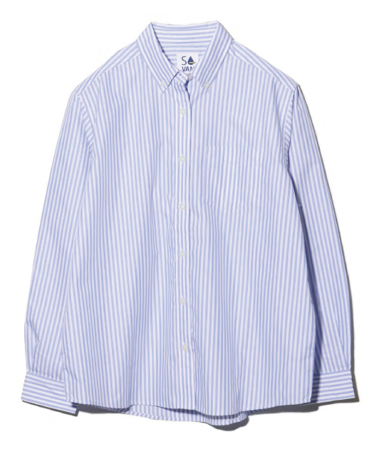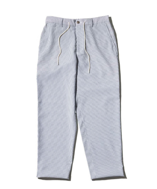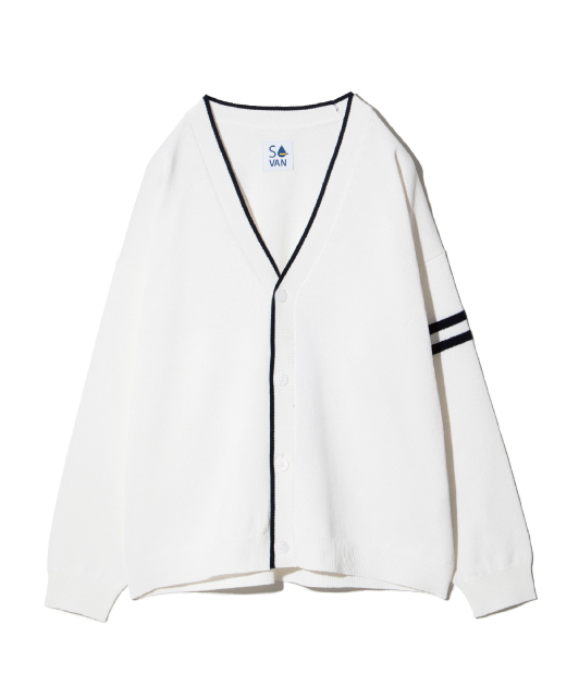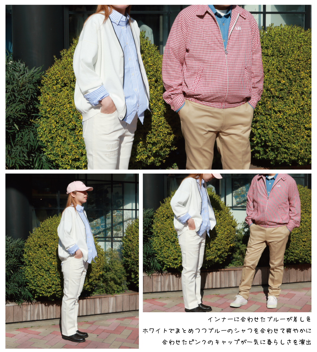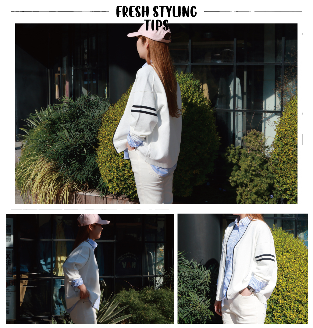 ホワイトでまとめたクリーンなスタイルに、インナーのブルーストライプシャツとピンクのキャップで春らしい彩りをプラス。袖に入ったラインがアクセントのニットカーディガンは、軽やかなペーパーニット素材で季節感も抜群。爽やかさと遊び心を兼ね備えたコーディネートに仕上がります。