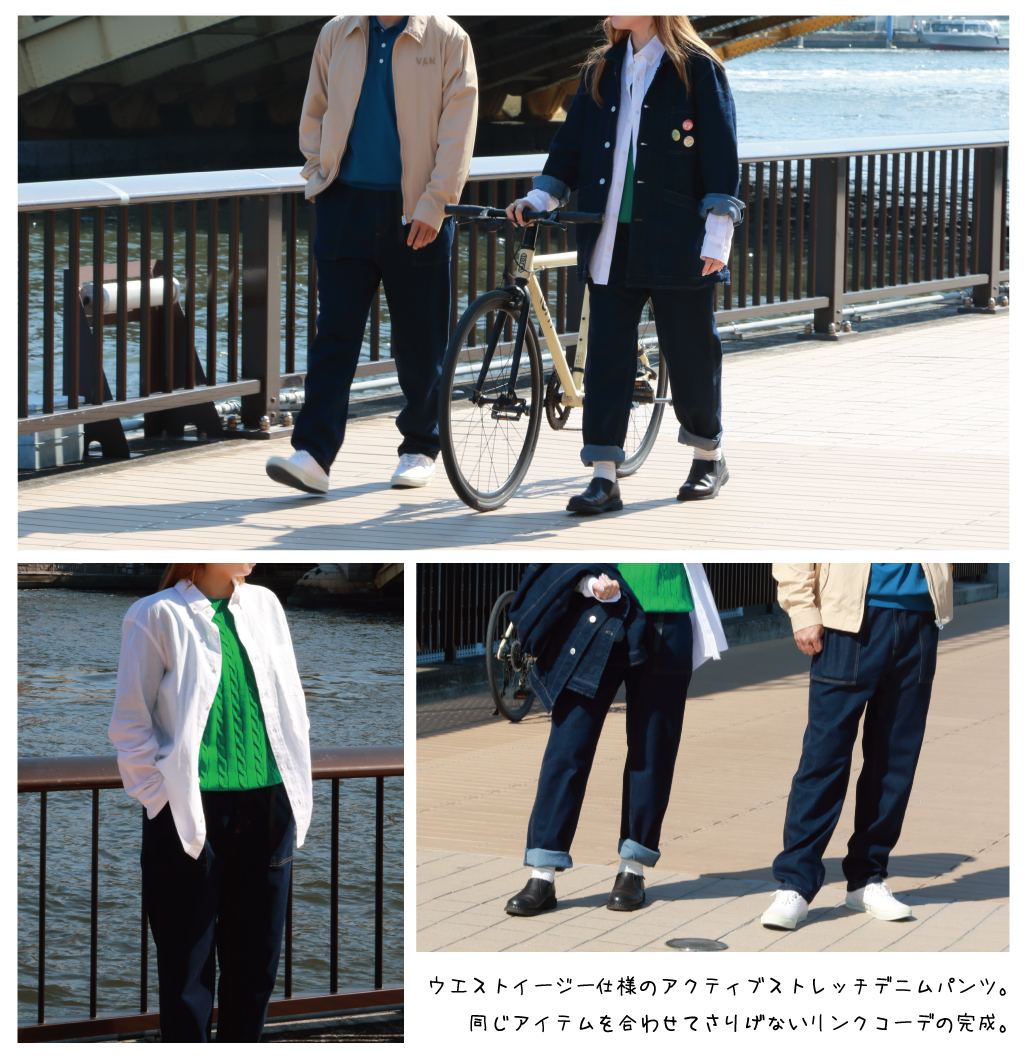 デニムセットアップに、コーデの主役になる鮮やかなグリーンのケーブルニットを合わせたスタイリング。パッと目を引くカラーが、シンプルなデニムに映えて一気に春らしい印象に。同じデニムを取り入れて、さりげなくリンクさせたコーディネートもおすすめ。統一感がありながら、それぞれの個性が引き立つバランスの良い着こなしを楽しめます。