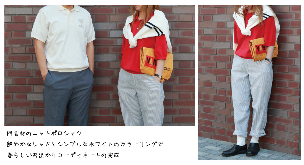 目を引く鮮やかなレッドのニットポロシャツに、爽やかなカラーリングのイージーサッカーパンツを合わせたコーディネート。軽やかな配色が春夏らしい抜け感を演出します。同素材のメンズニットポロシャツ(ホワイト)に合わせて、ホワイトのカーディガンを羽織ったスタイルもおすすめ。クリーンで統一感のある着こなしを楽しめます。