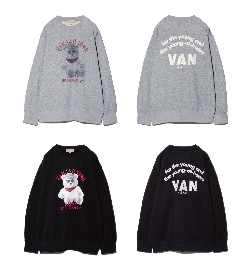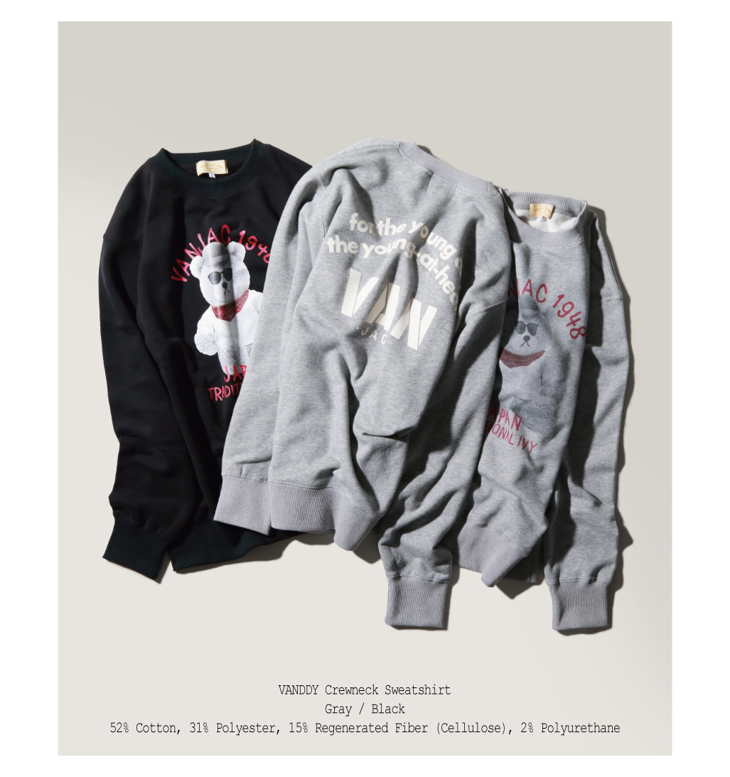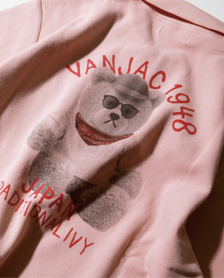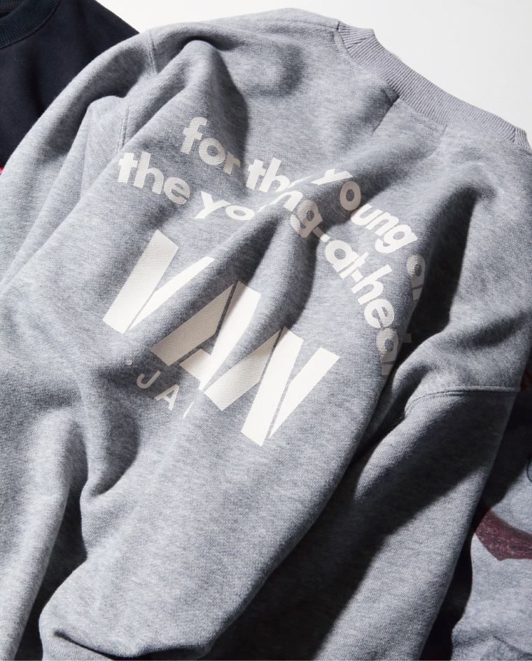 綿・ポリエステル・再生繊維をブレンドした裏毛素材を使用。再生繊維を取り入れることで、やさしい肌触りと軽やかな着心地を実現しました。さらにストレッチ素材も加え、ほどよい伸縮性のある快適な着用感に仕上げています。フロントには今期から登場したVANDDYくんをプリントし、キャッチーなアクセントをプラス。背中には定番のアーチロゴを配し、VANらしさもしっかりと表現しました。遊び心のあるデザインと柔らかな素材感が魅力の、コーディネートの主役になる一枚です。