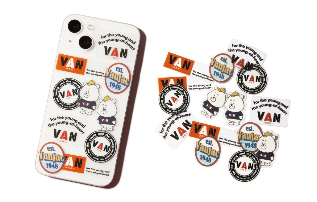 VANの新キャラクターVANDDYを中心に、今期の新グラフィックや人気の定番ロゴを揃えたクリアフレークシールセット。使いやすいサイズ感の5種類が各3セット入りで、ノートやスマートフォン、身の回りのアイテムに手軽に貼ってアレンジをお楽しみいただけます。