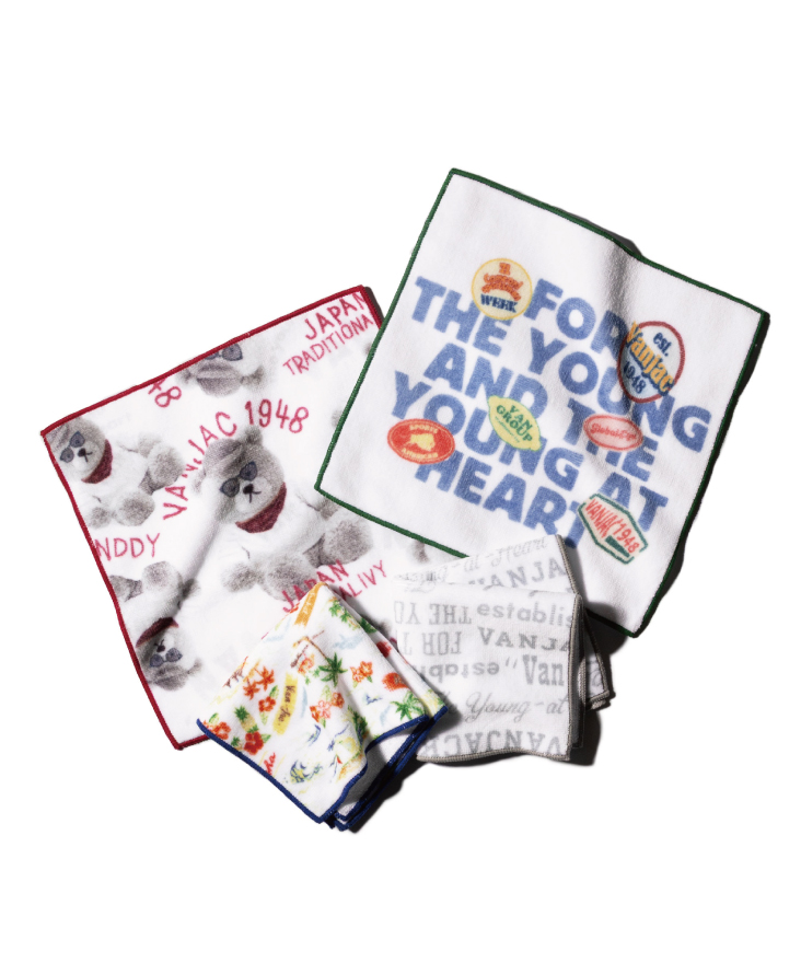 VANDDYモチーフをあしらった小物シリーズ。日常にさりげない遊び心を添えるアイテムが揃いました。ハンカチはやわらかな肌触りの素材を使用し、バッグやポケットに収まりやすいサイズ感。前面にVANDDYモチーフが入った存在感のあるデザインはギフトにもおすすめです。ネクタイはベーシックなカラーをベースに、VANDDYモチーフを上品にレイアウト。ビジネススタイルにも取り入れやすく、コーディネートに程よい個性をプラスします。フレークシールは手帳やスマートフォン、ノートなど身の回りのアイテムを手軽にアレンジできるデザイン。複数枚セットで、アレンジの幅も広がります。