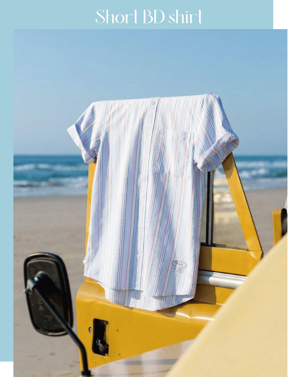 綿100%素材にバイオ加工を施し、やわらかく味わいのある風合いに仕上げた一着。さらりとした肌ざわりで、デイリーに心地よく着用いただけます。サックスカラーをベースに、2種類のトリプルストライプを組み合わせた爽やかなデザインが印象的。ほどよいアクセントを効かせながら、清潔感のあるスタイルを演出します。衿元は5.5cmのショートボタンダウン仕様で、カジュアルさの中にもきちんと感をプラス。さらに、タックアウトした際に左裾からさりげなく覗くスタンプ風のワンポイントが、さりげない個性を添えています。