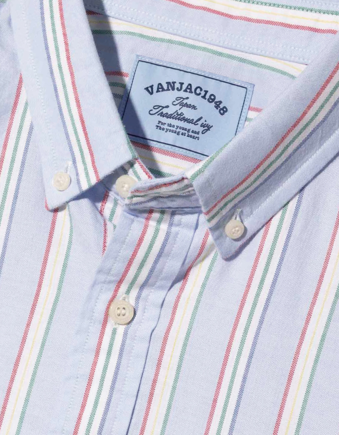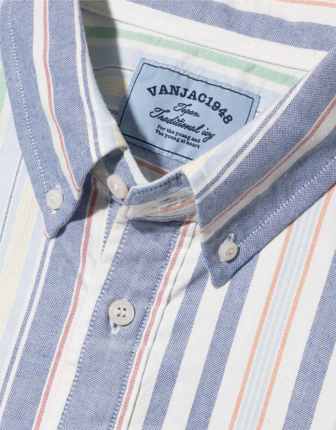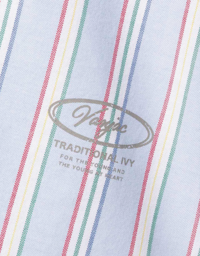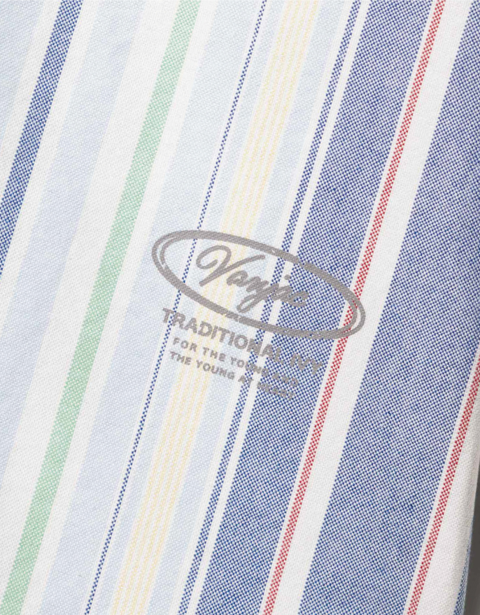 綿100%素材にバイオ加工を施し、やわらかく味わい深い風合いに仕上げた一着。ツイル素材ならではのしなやかさと上品な表情が、日常の装いにほどよい品格を添えます。グレーのロンドンストライプをベースに、異なる配色を組み合わせたアイビーストライプ風デザインが印象的。クラシックな雰囲気を感じさせながらも、新鮮なバランスで着こなしを引き立てます。衿元は5.5cmのショートボタンダウン仕様で、カジュアルさの中にもきちんと感をプラス。さらに、タックアウトした際に左裾からさりげなく覗くスタンプ風のワンポイントが、控えめながらも個性を演出します。