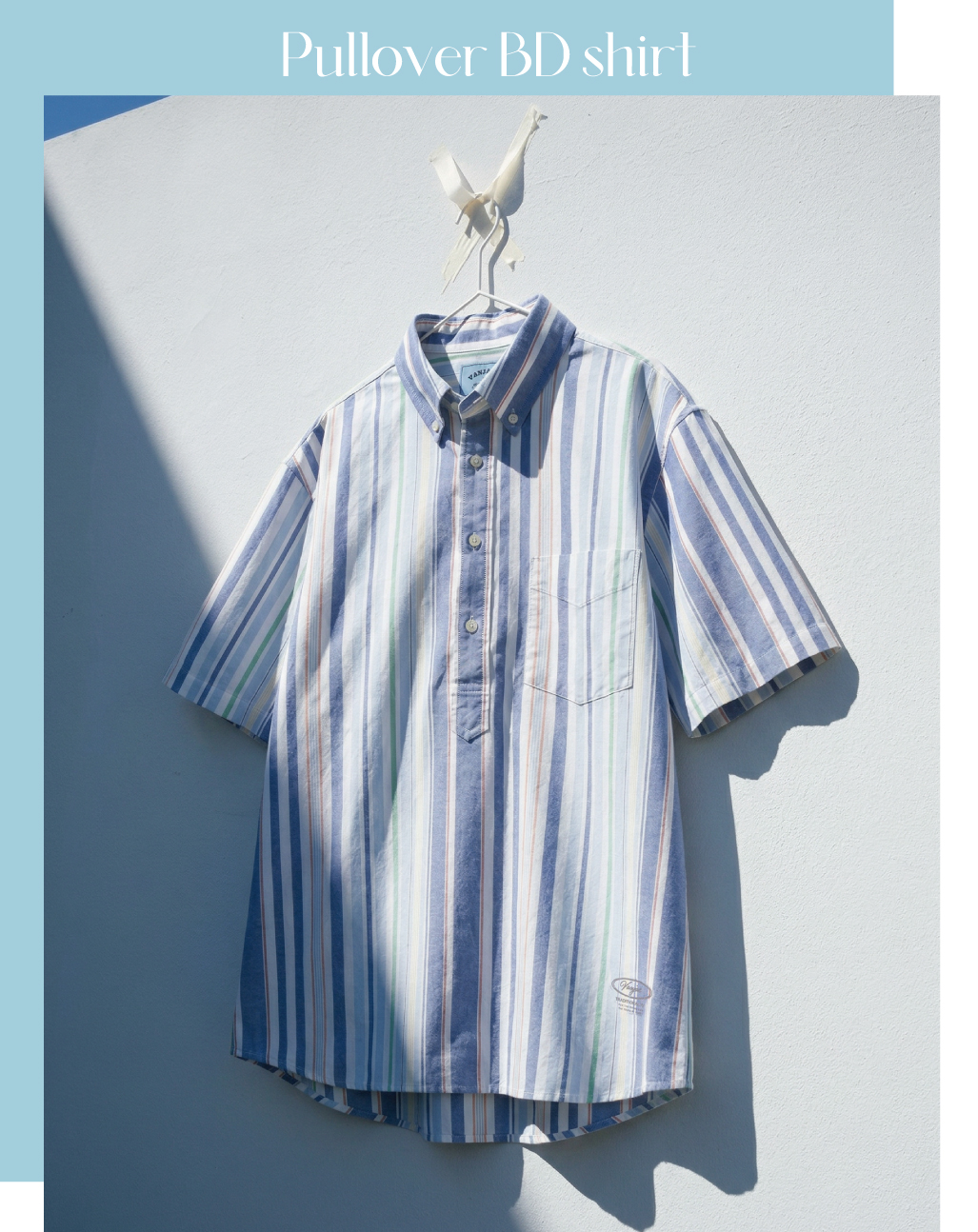 綿100%素材にバイオ加工を施し、やわらかく味わいのある風合いに仕上げた一着。ほどよい厚みと上品な表情が魅力のオックスフォード生地を使用し、きちんと感と快適さを兼ね備えています。ランダムに配置されたマルチストライプが着こなしに程よいアクセントを添え、シンプルながらも印象的なスタイルに。頭からさっと被れるプルオーバータイプで、リラックス感のあるこなれた雰囲気を演出します。タックアウトした際に左裾からさりげなく覗くスタンプ風のワンポイントも、細部までこだわったポイントです。
