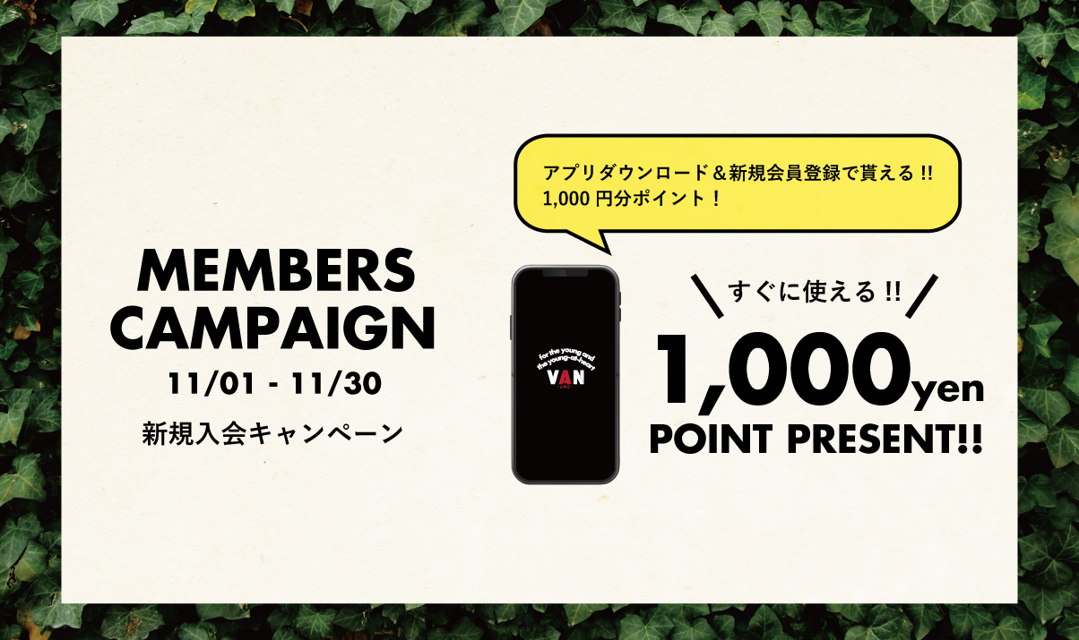 11月1日から11月30日の期間中、ヴァンメンバーズ新規会員登録をしていただくと、VANSHOP各店、オンラインストアにて使える1,000ポイントプレゼント!