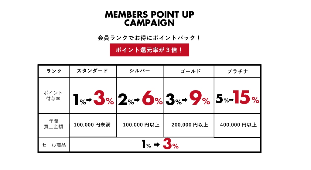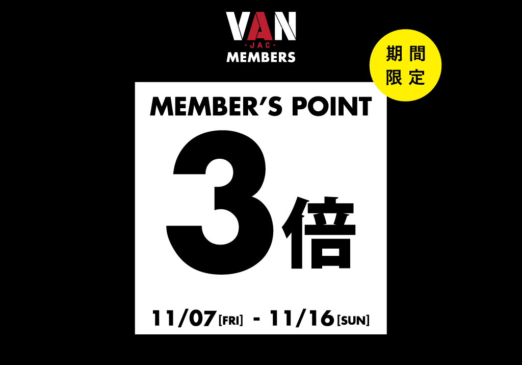 11月07日から11月16日の期間中、ヴァンメンバーズ導入店舗とオンラインストアにて商品をお買い上げで、ランクに応じて3倍ポイントプレゼント!